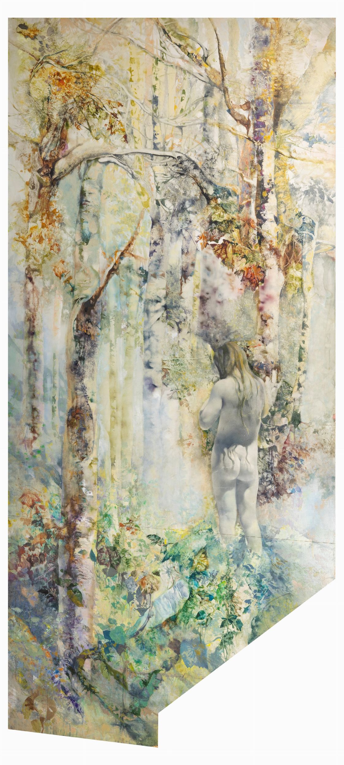 tecnica mista su due tavole unite e sagomate, cm 300 x 142