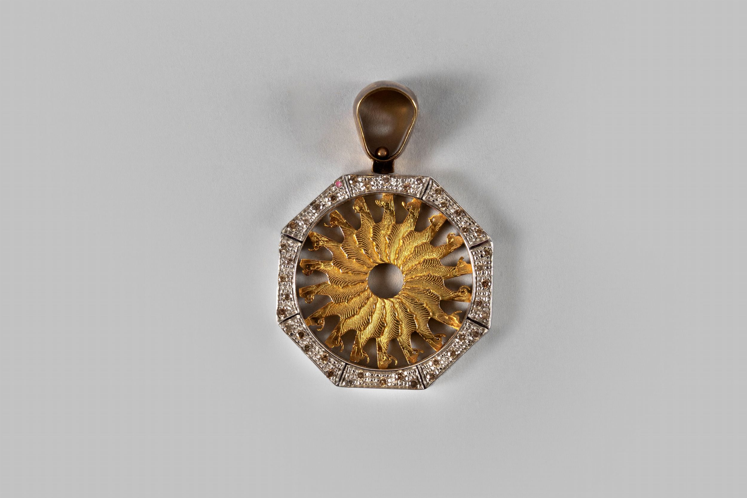 pendente ottagonale in oro bianco e giallo 18 ct con piccoli brillanti, esemplare unicoorafo Pietro, cm 4,5, gr 18.7