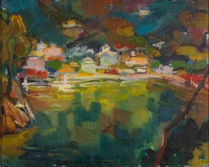 Vittorio Paradisi (1934 Lecce) Paesaggio con alberi con sfondo di case