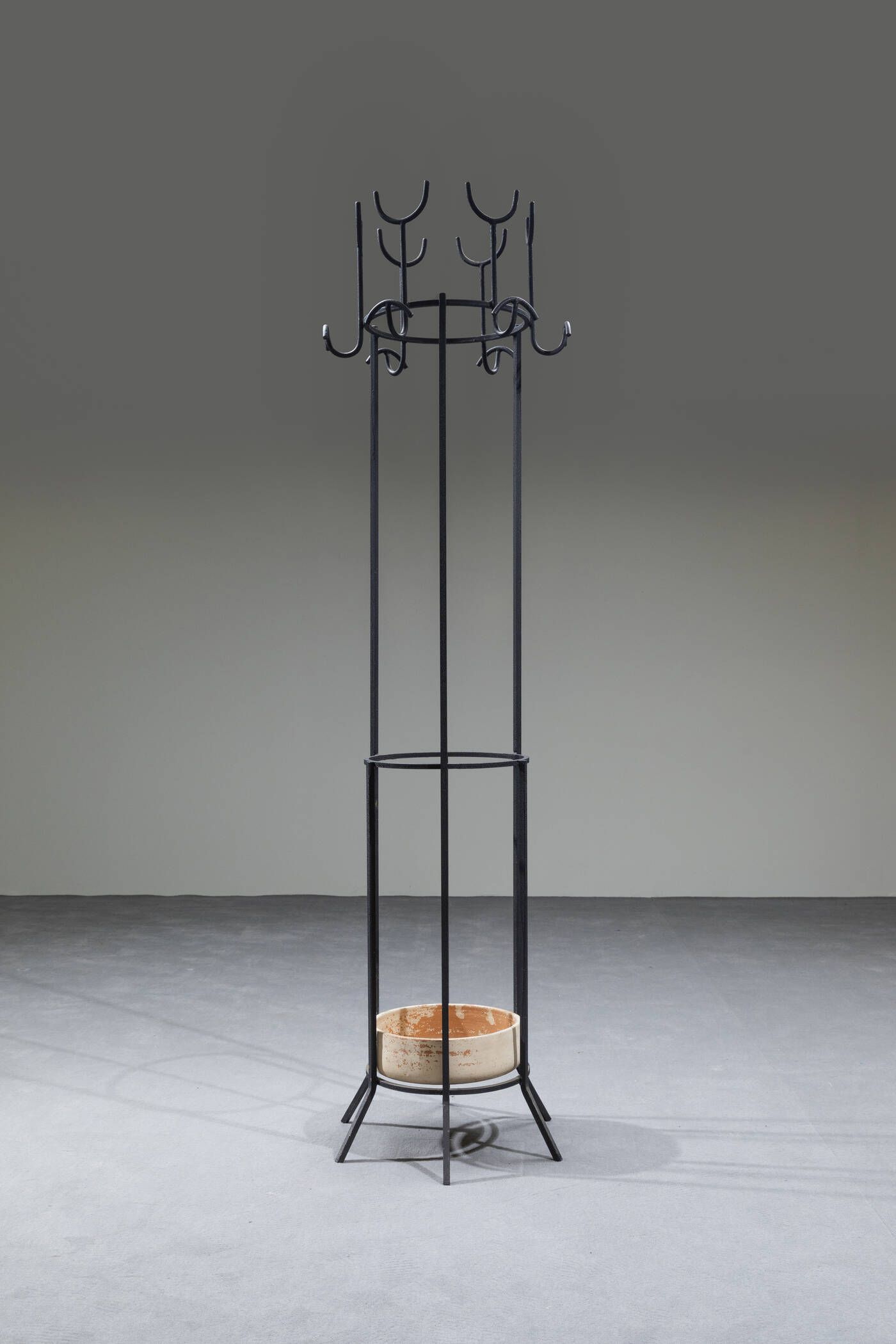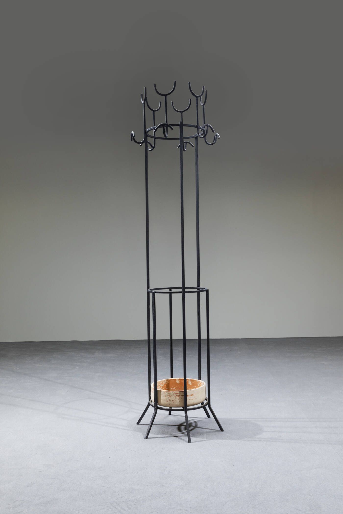 Appendiabiti in metallo verniciato con smalto raggrinzante e ciotola in terracotta smaltata. Prod. Home anni '60 cm 188x35