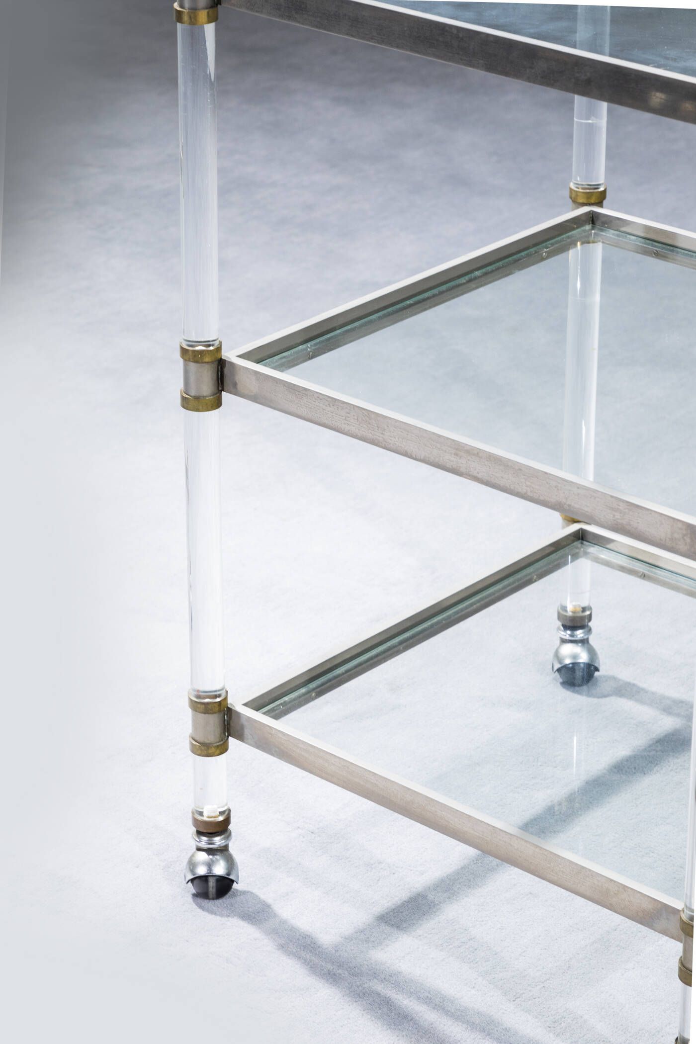 Struttura in acciaio e plexiglass con tre piani in vetro. Anni '70 cm 84x55x55
