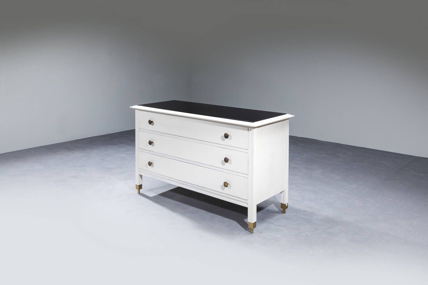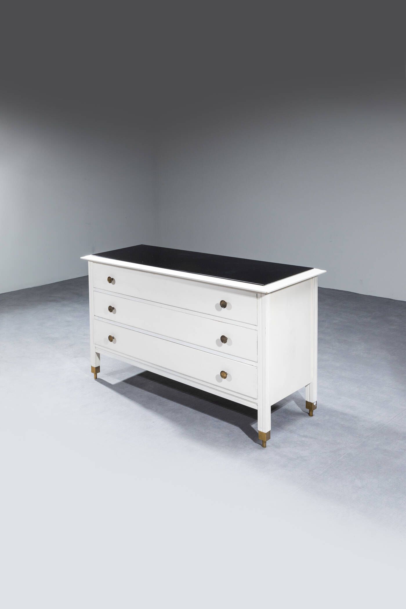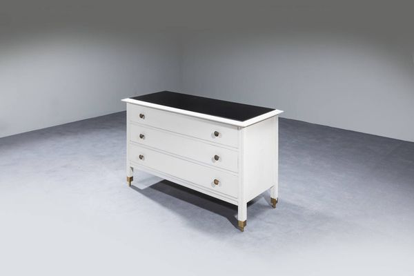 Cassettone in legno laccato con pomelli e puntali in ottone piano opalino. Prod. [..]