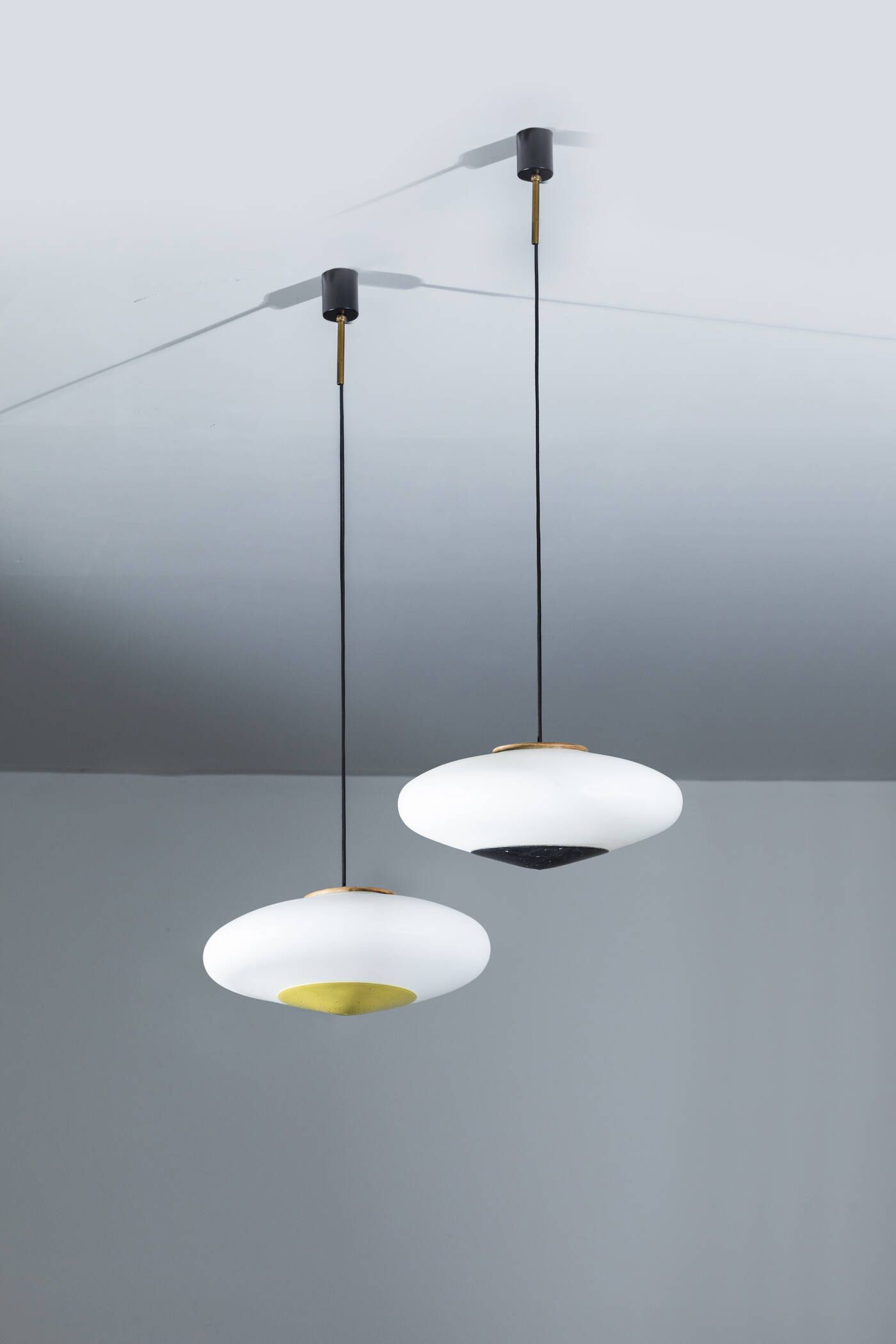 Coppia di lampadari con vetro satinato e metallo verniciato. Prod. Stilnovo anni [..]