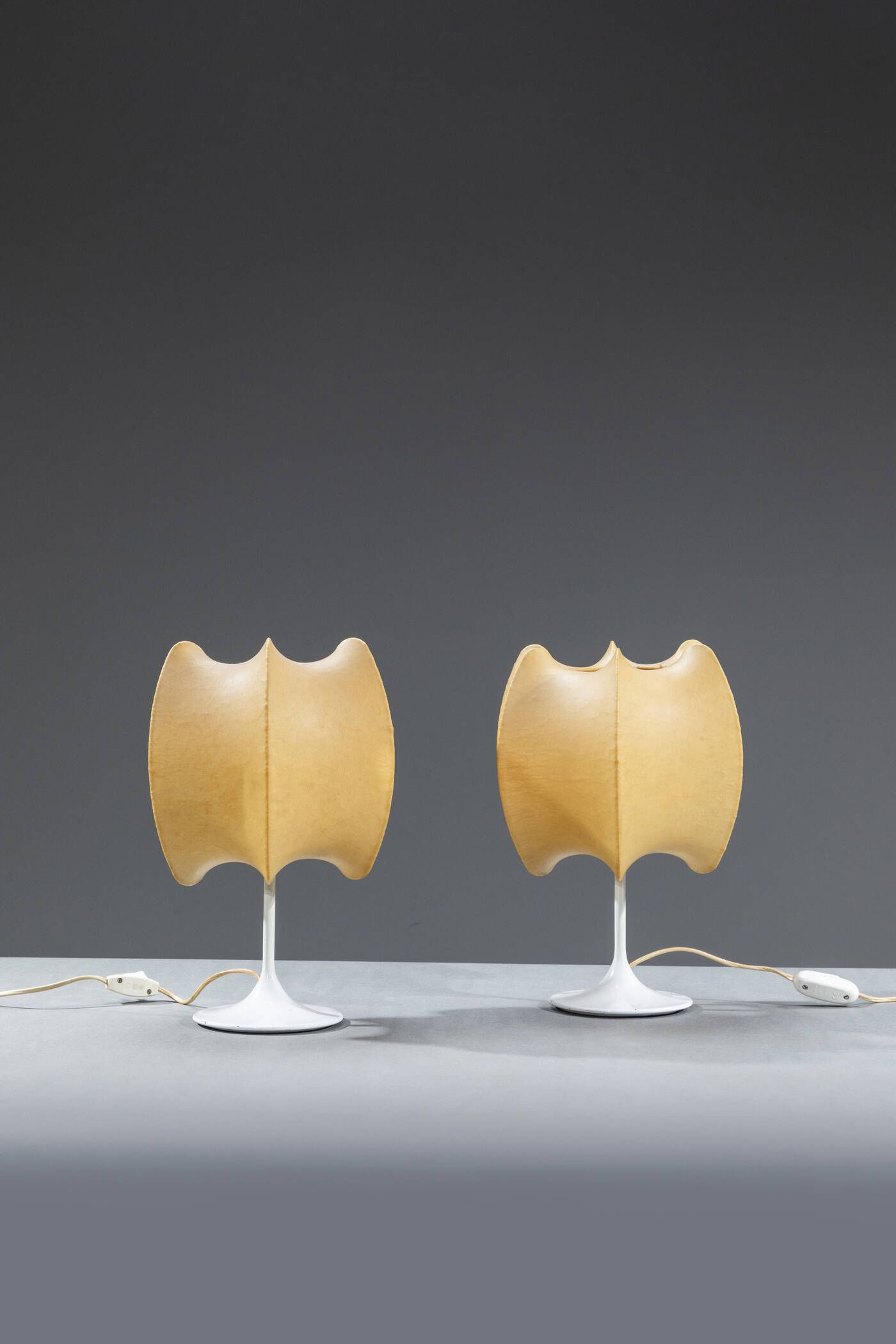 Coppia di lampade da tavolo con struttura in metallo laccato e paralume in coccon. [..]