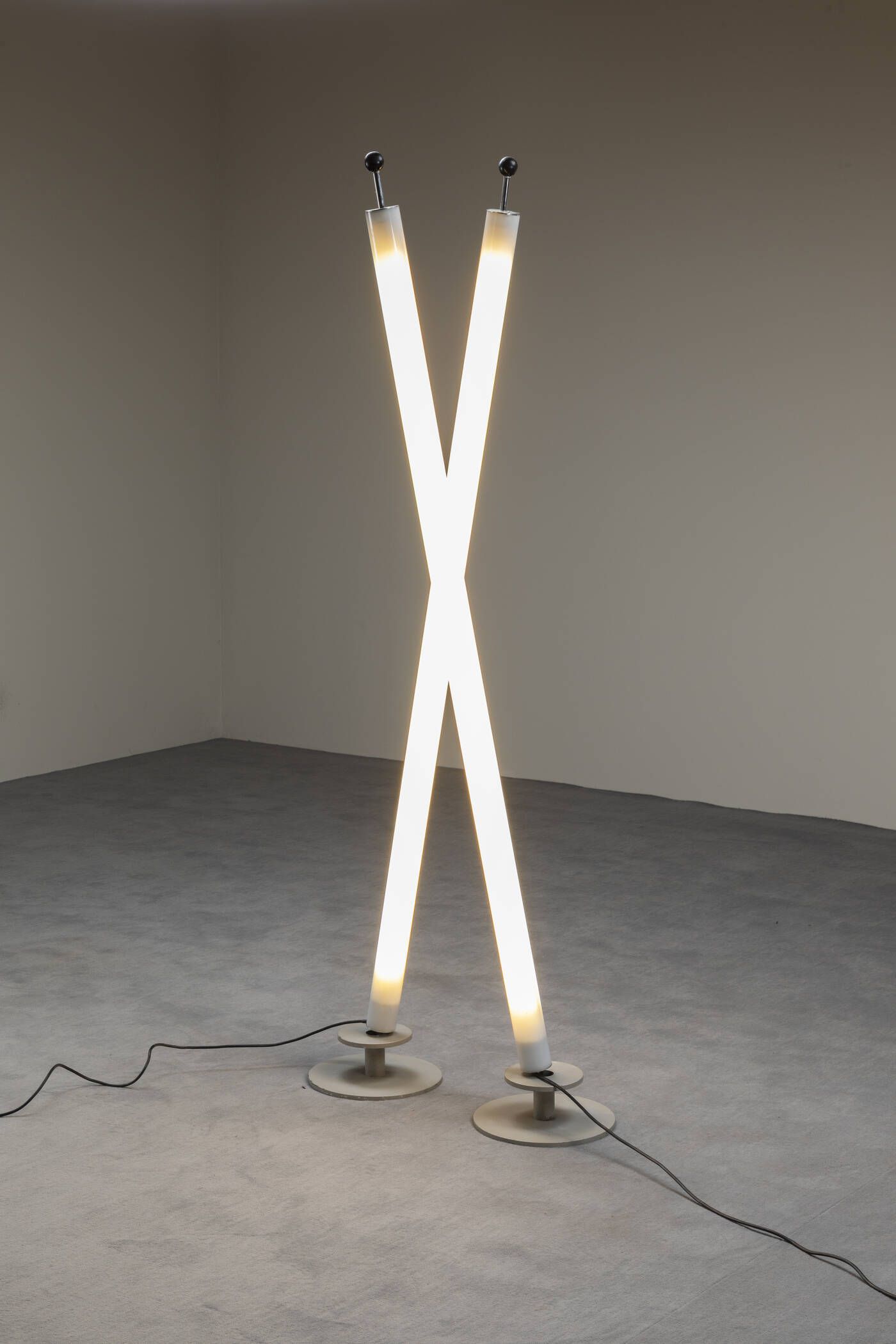 Coppia di lampade da terra costituite da un tubo in metacrilato base in metallo. 1997 h cm 178