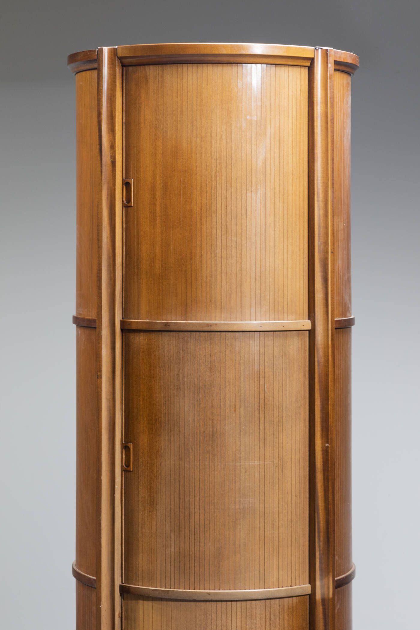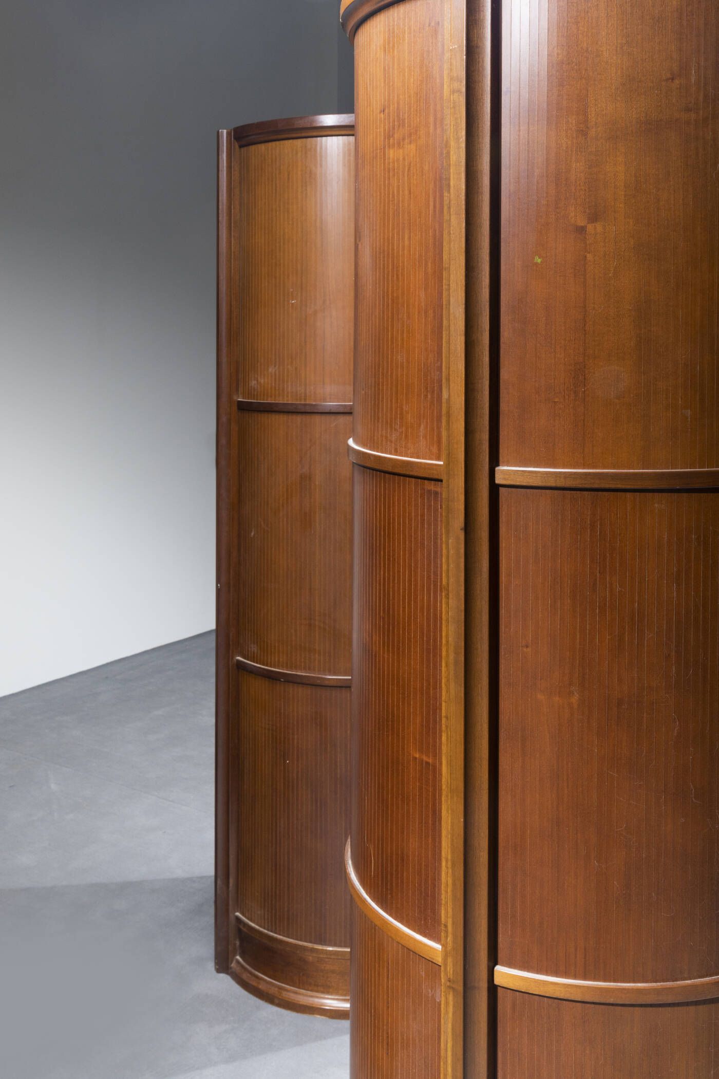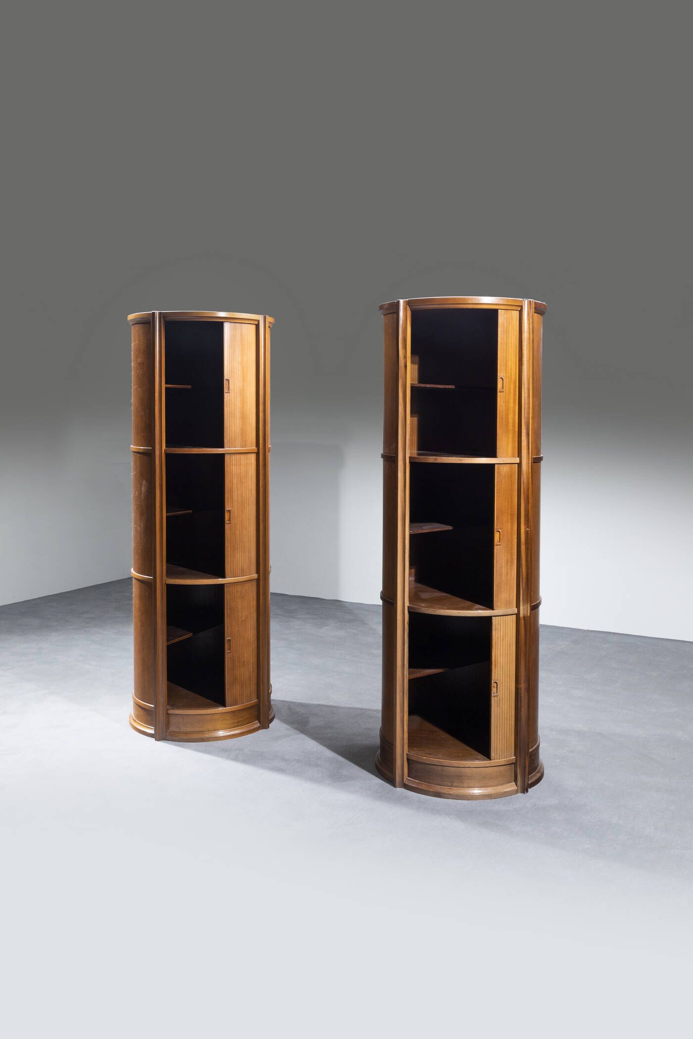 Coppia di mobili contenitori in legno di noce con ante scorrevoli. Anni '70 cm 189x72