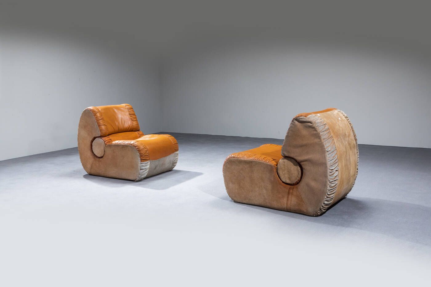 Coppia di poltrone con imbottitura rivestita in pelle e camoscio. Anni '60 cm 78x67x100 Difetti