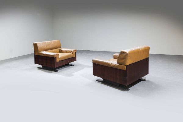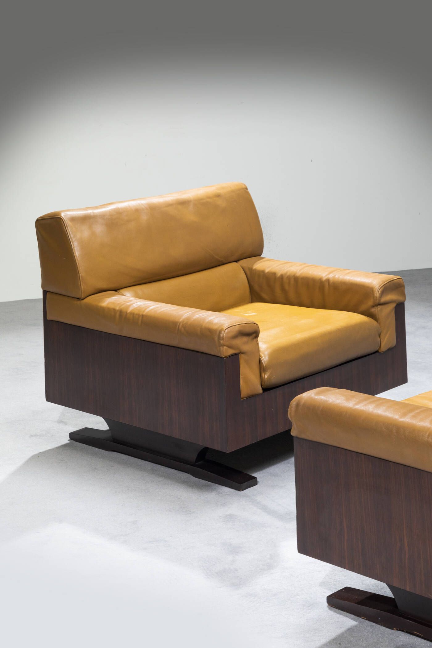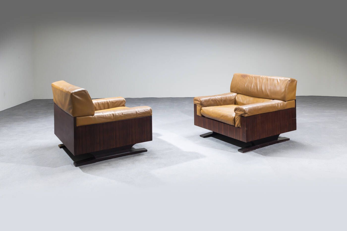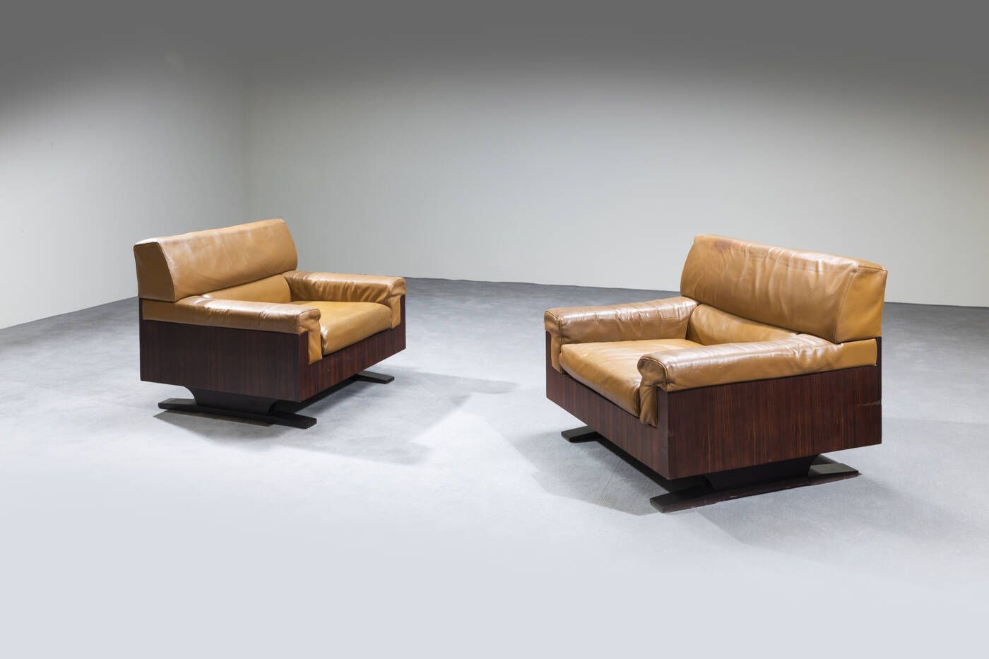 Coppia di poltrone con struttura in legno e imbottitura rivestita in pelle. Anni '60 cm 73x86x86 Difetti