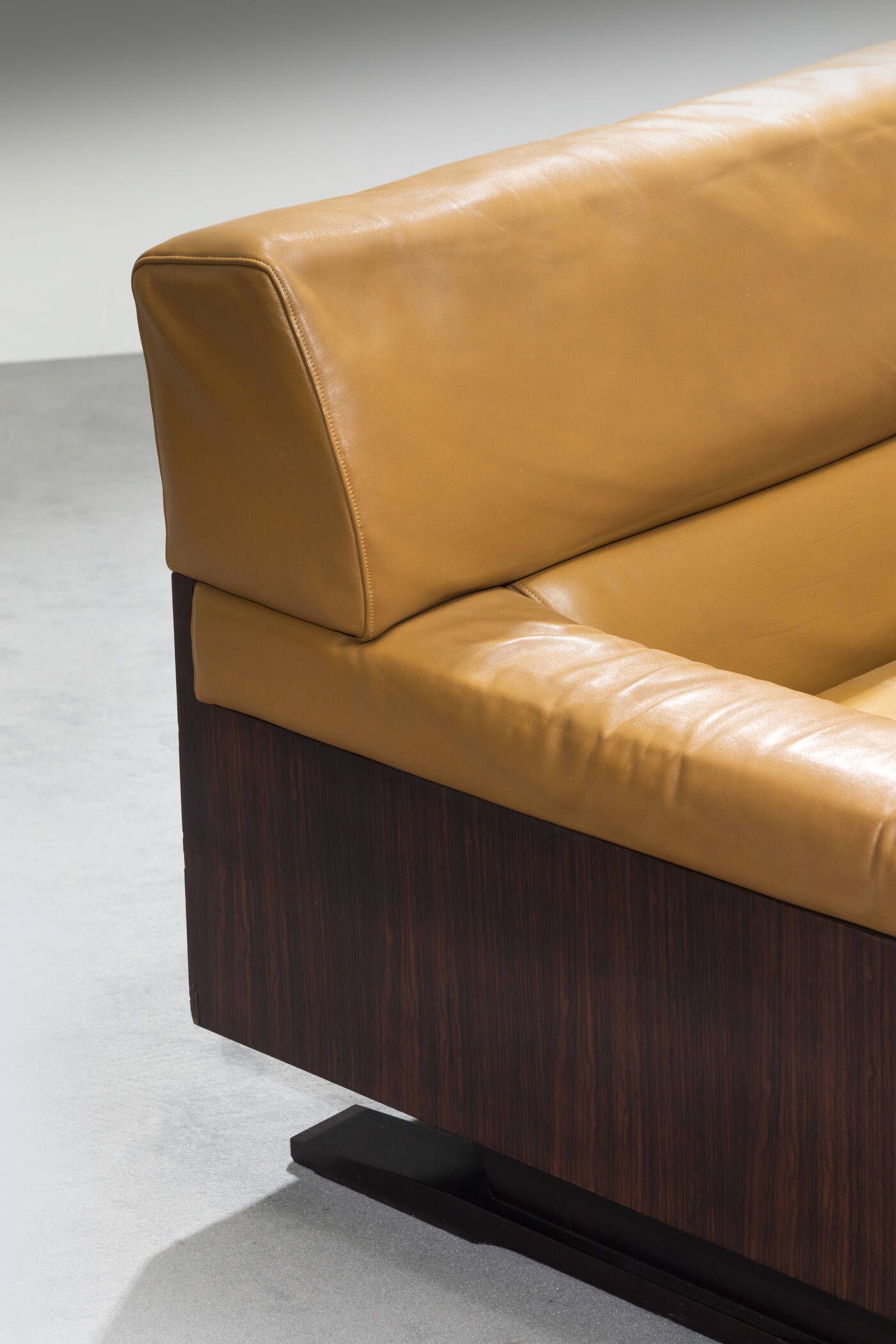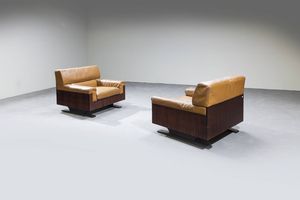 Coppia di poltrone con struttura in legno e imbottitura rivestita in pelle. Anni [..]