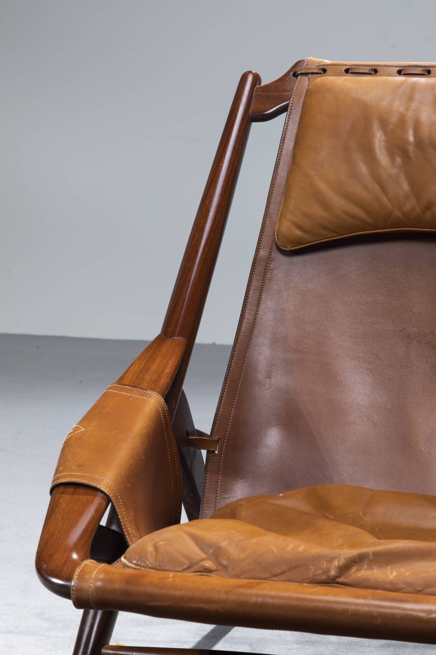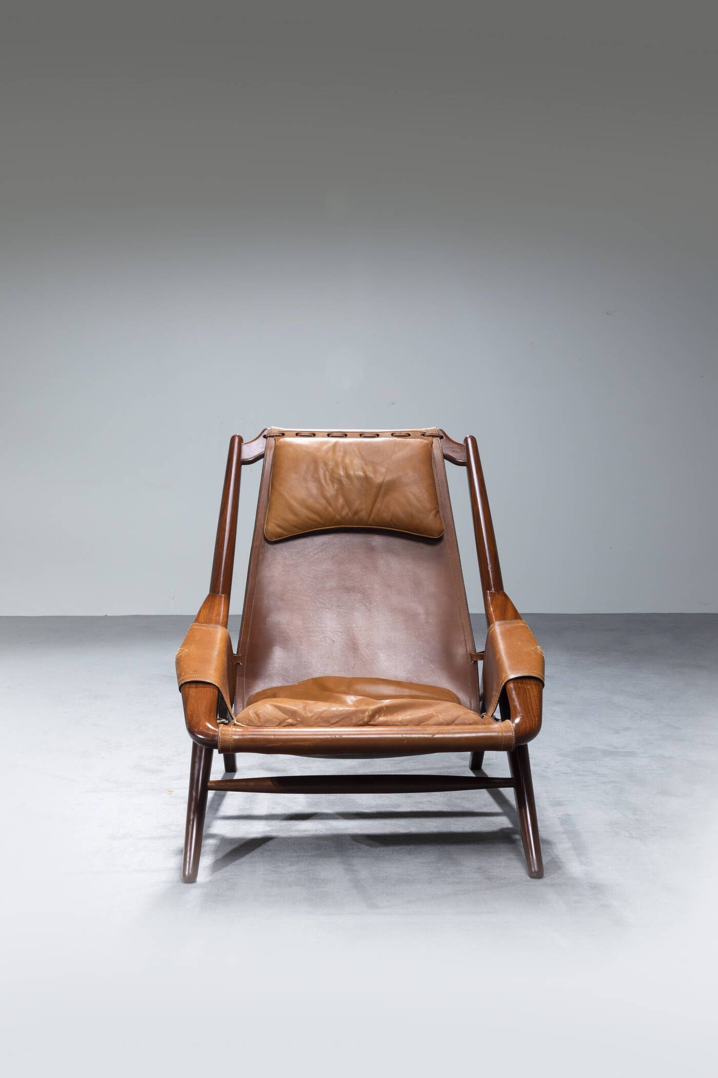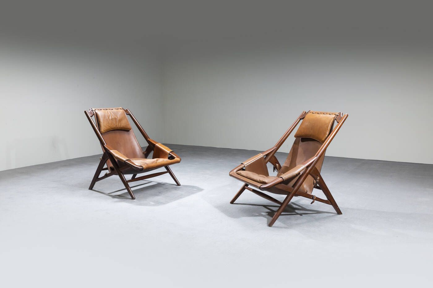 Coppia di poltrone in legno e seduta in cuoio. Etichetta del Produttore Anni '60 [..]