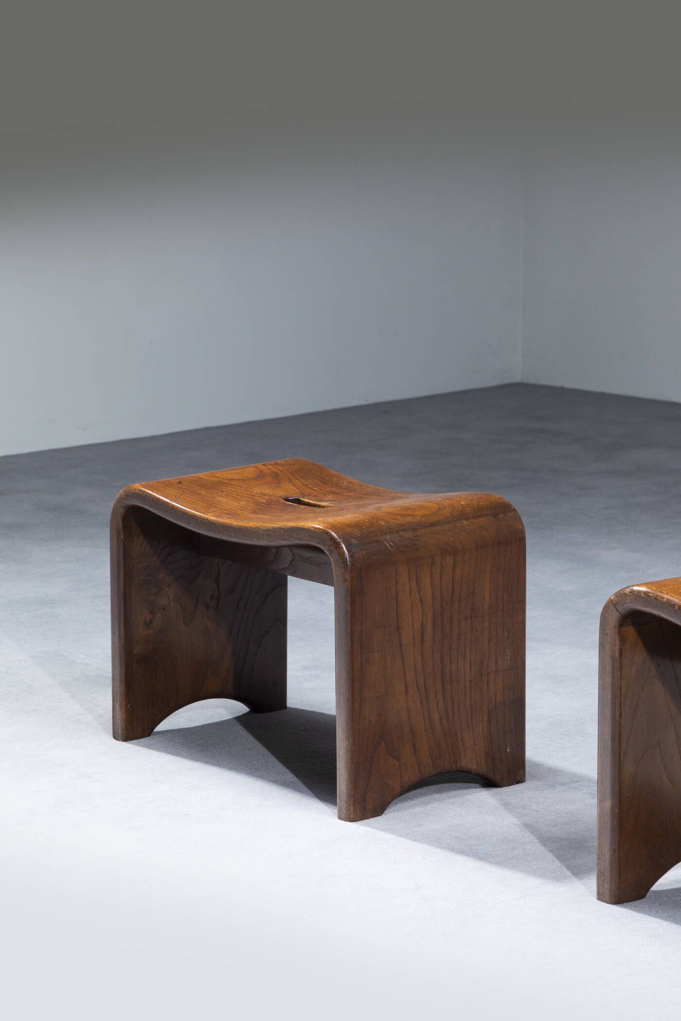 Coppia di sgabelli legno massello curvato e forato. Anni '50 cm 37x46x29 5 Corredato dell'Expertise del Gio Ponti Archives Difetti