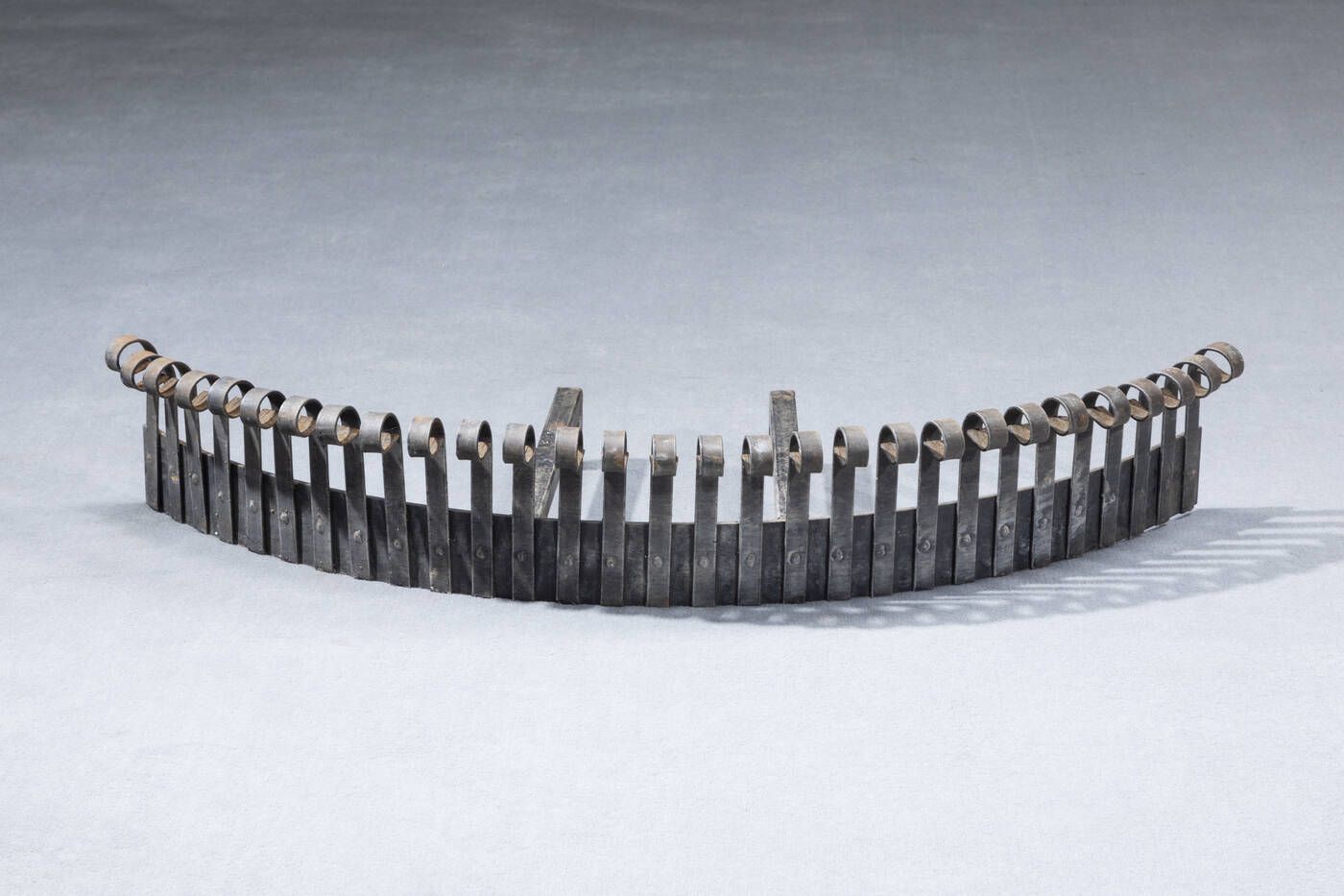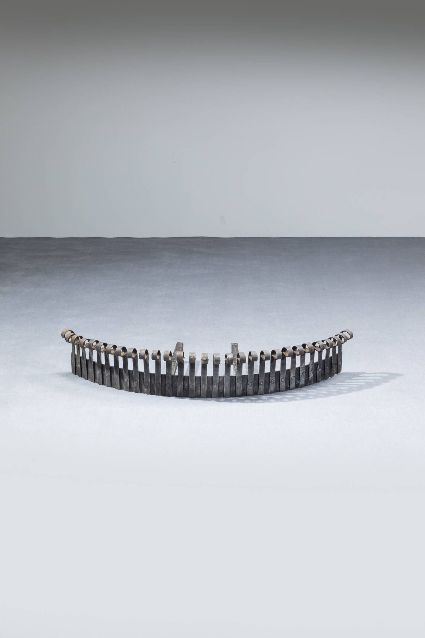 Grande alare in ferro da camino realizzato per abitazione privata. Anni '60 cm 18x106x40 Bibl.: foto storica dell'epoca