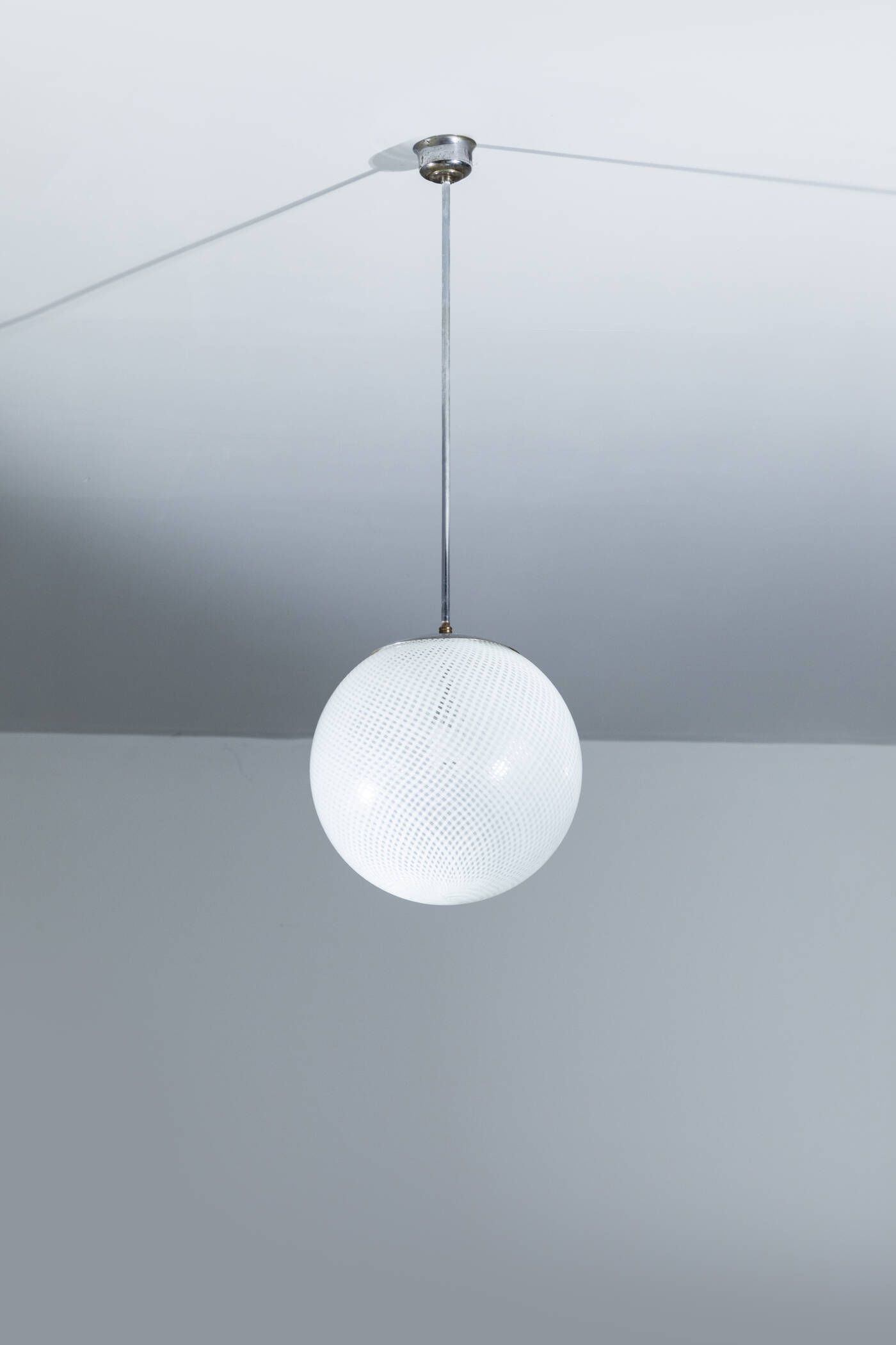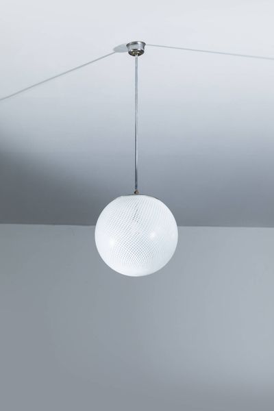 Lampada a sospensione con diffusore in vetro lavorato a filigrana. Prod. Venini [..]