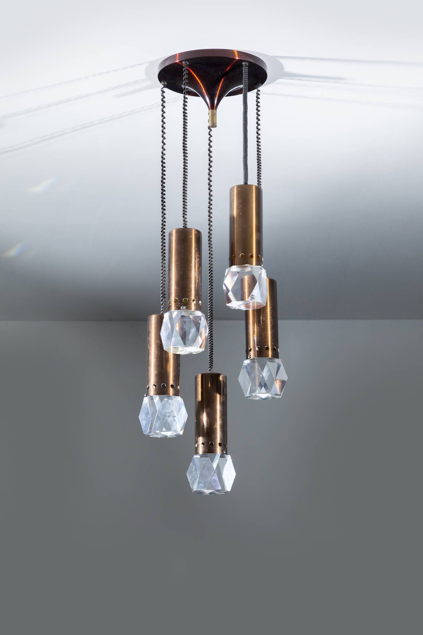 Lampada a sospensione in metallo cromato e perspex. Prod. Missaglia anni '70 h cm 102x28x28