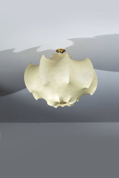 Lampada a sospensione a luce diffusa in filo metallico rivestito in resina cocoon. Prod. Flos 1960 h cm 58x70 Bibl.: Giuliana Gramigna Repertorio del Design Italiano1950-2000 per la'arredamento domestico Allemandi 2011 pag. 84