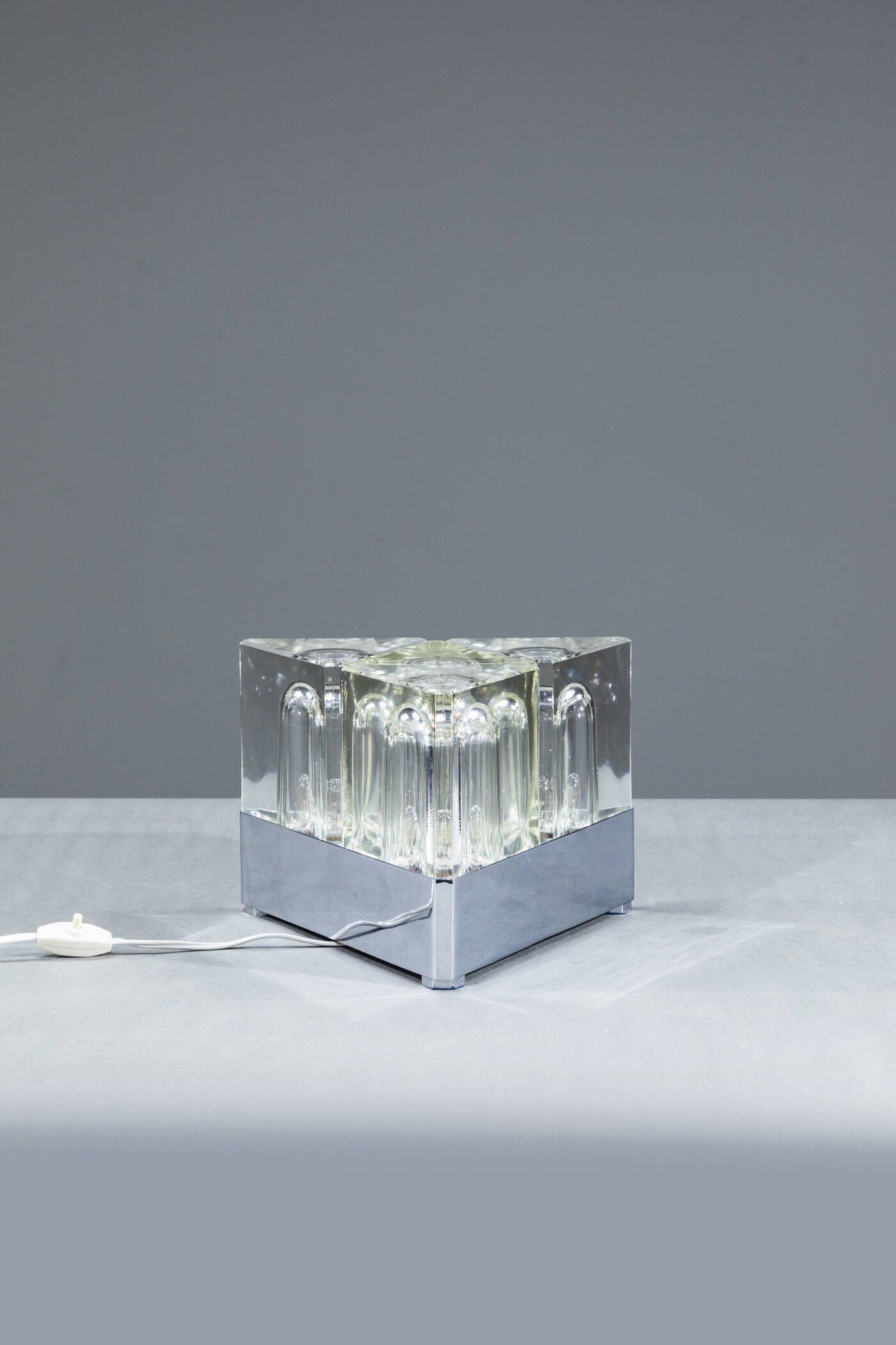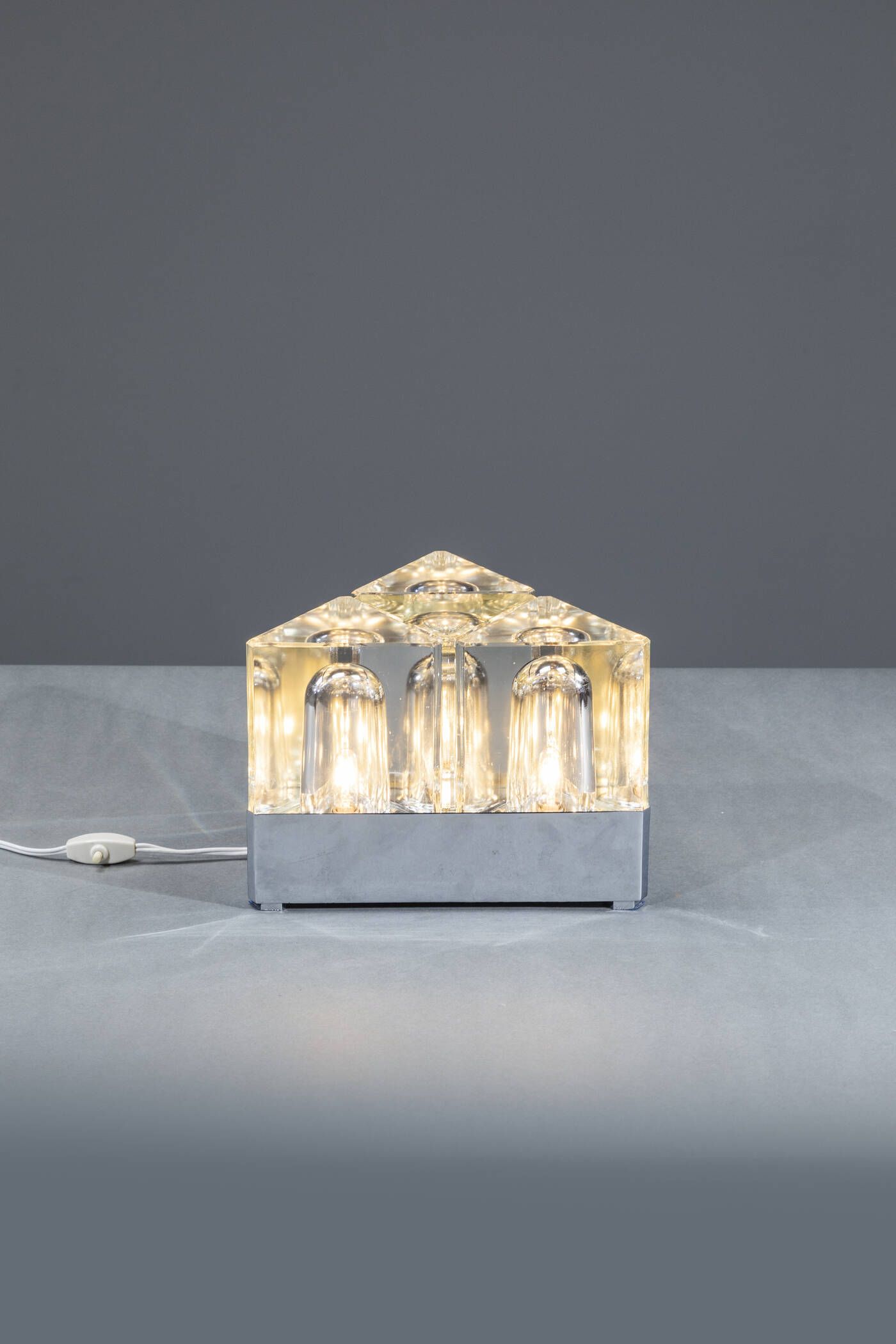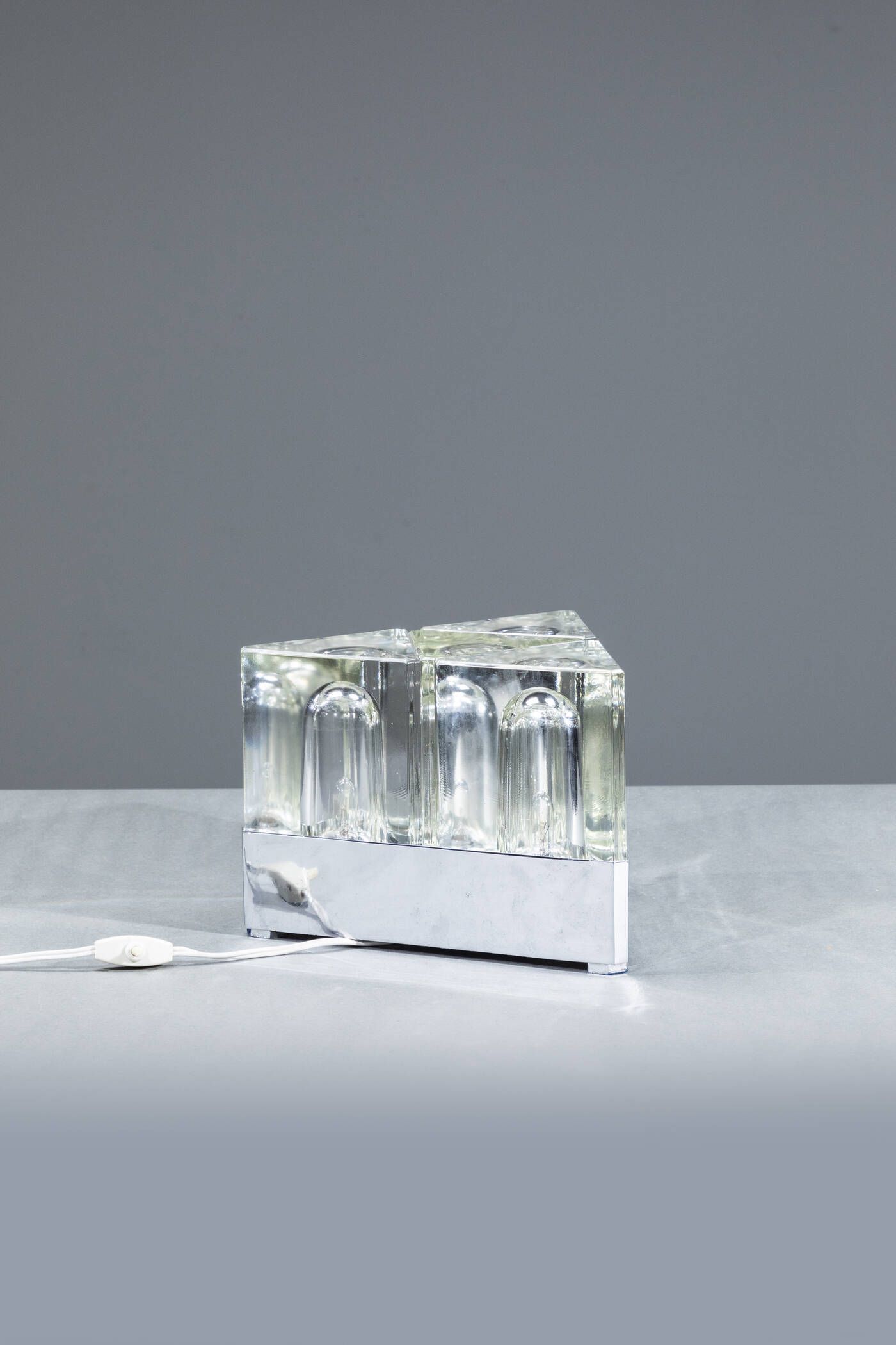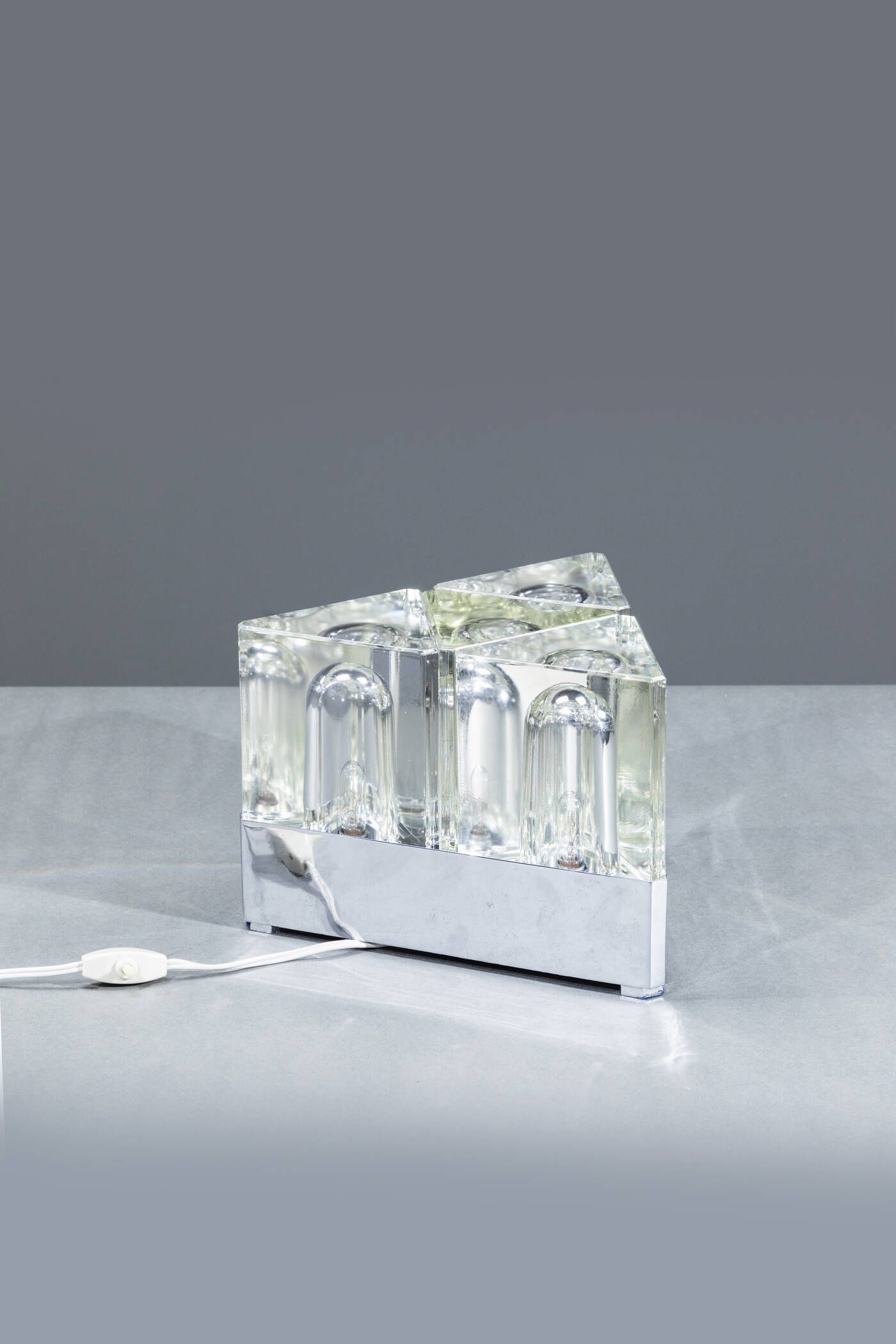 Base in metallo cromato e diffusori in vetro di forte spessore trasparente. Scatola originale Prod. Fidenza Vetraria anni '70 h cm 19x27x23