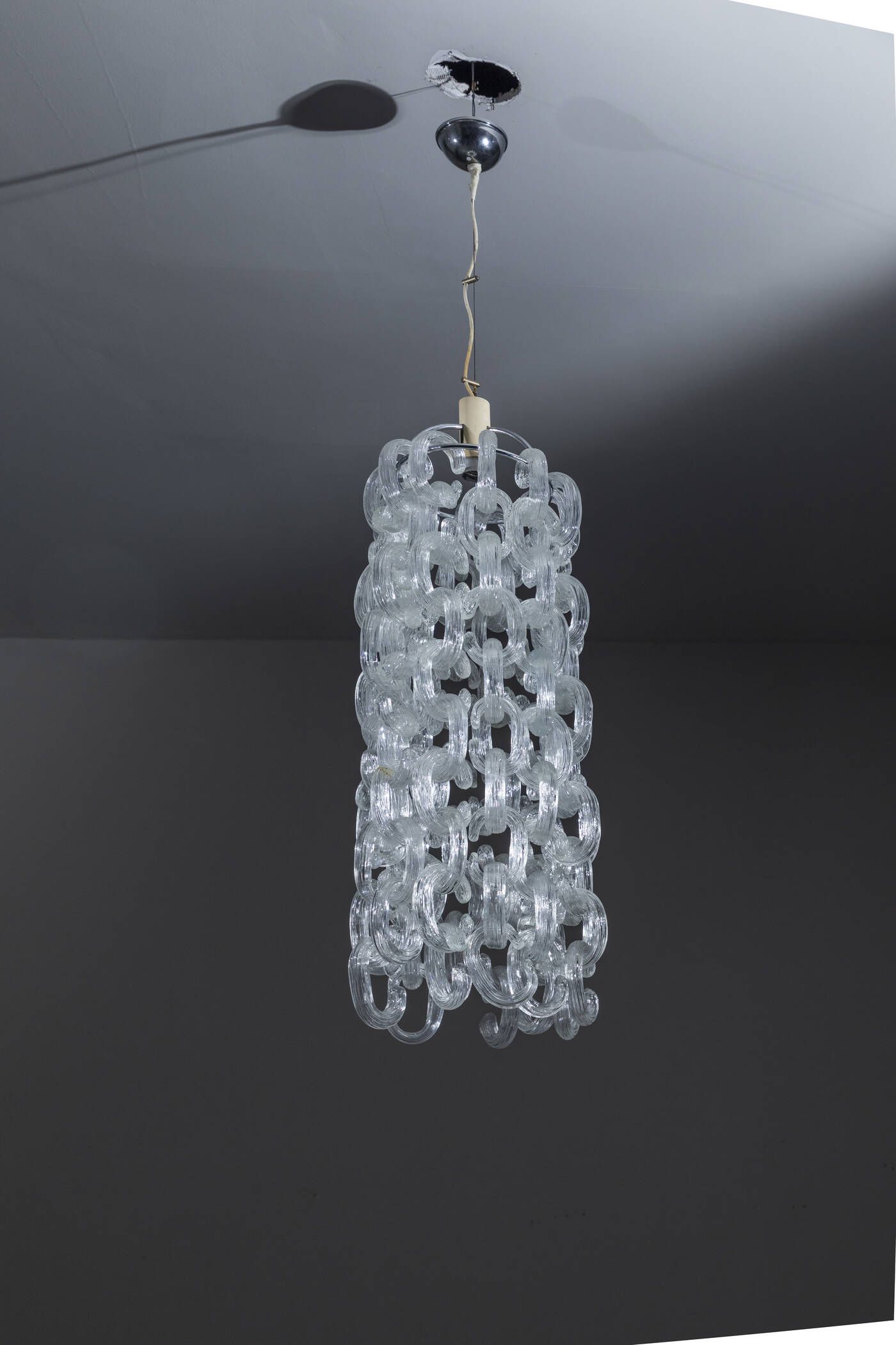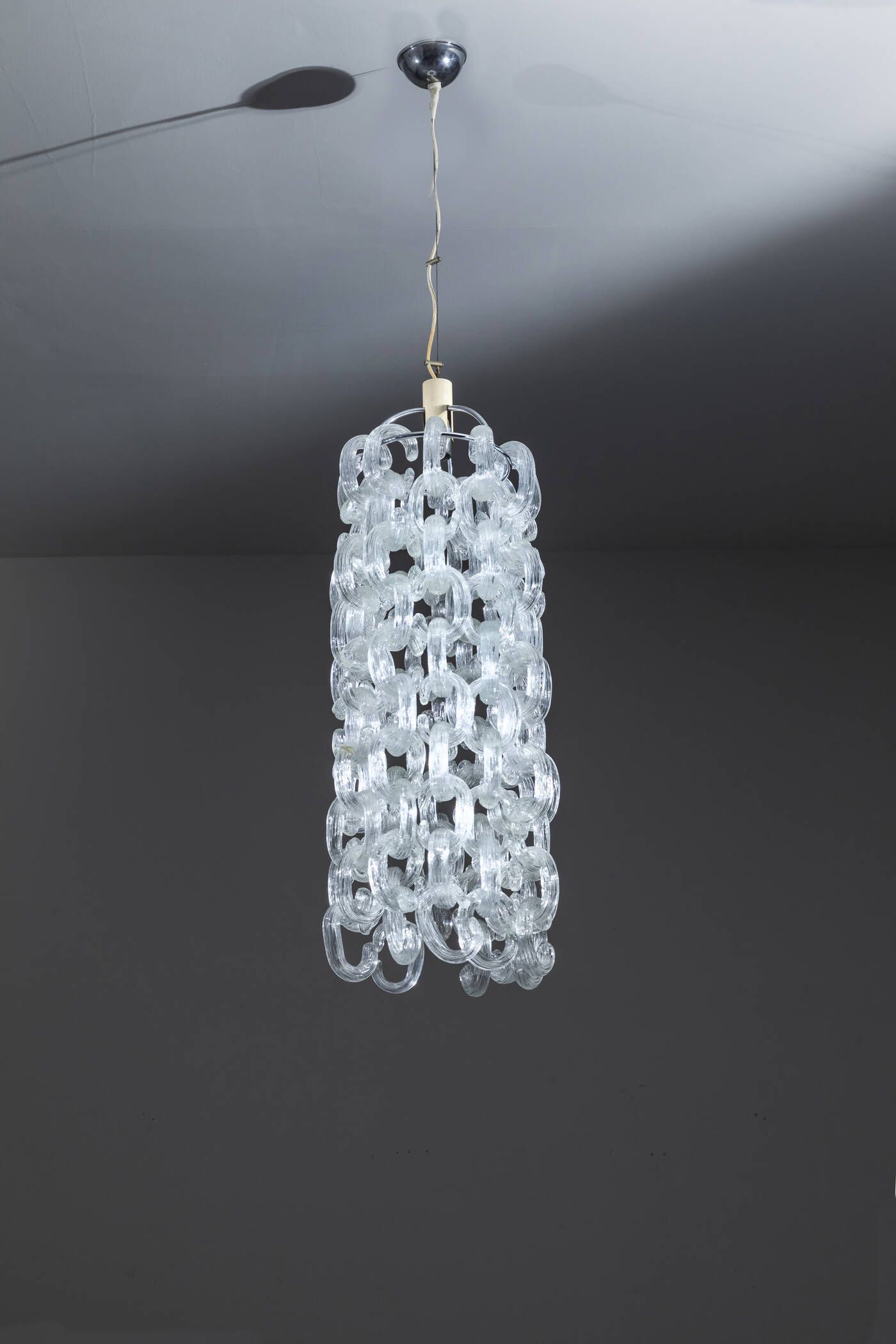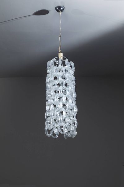 Lampadario con struttura in metallo ed elementi diffusori componibili in vetro di Murano. Prod. F.lli Toso anni '70 cm 125x30