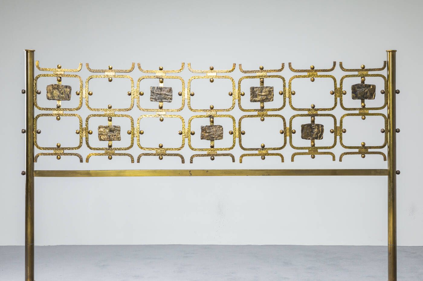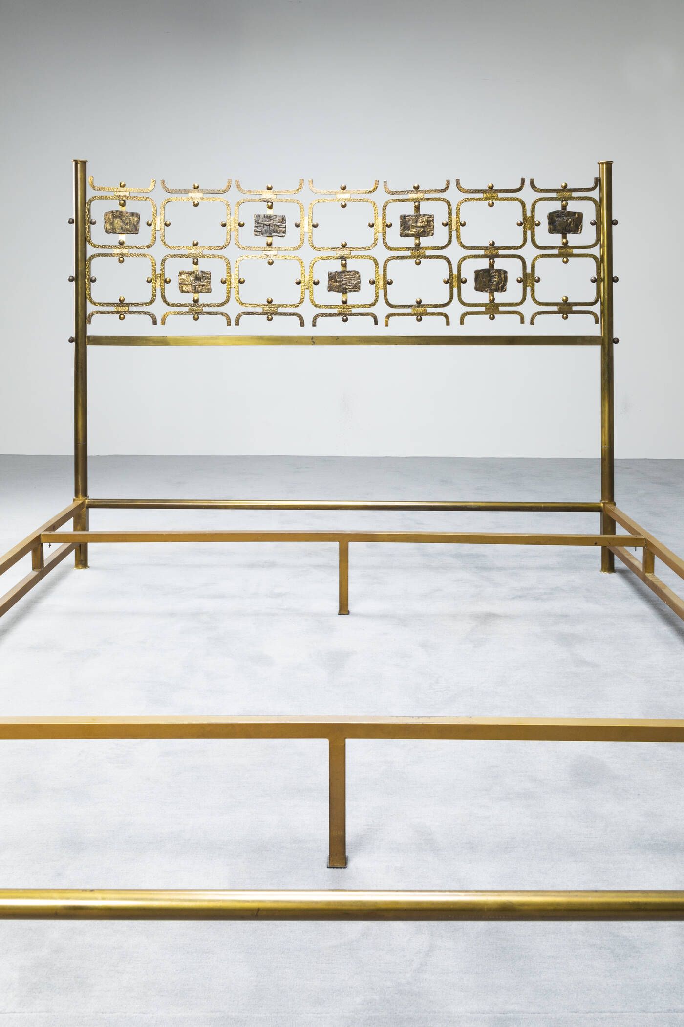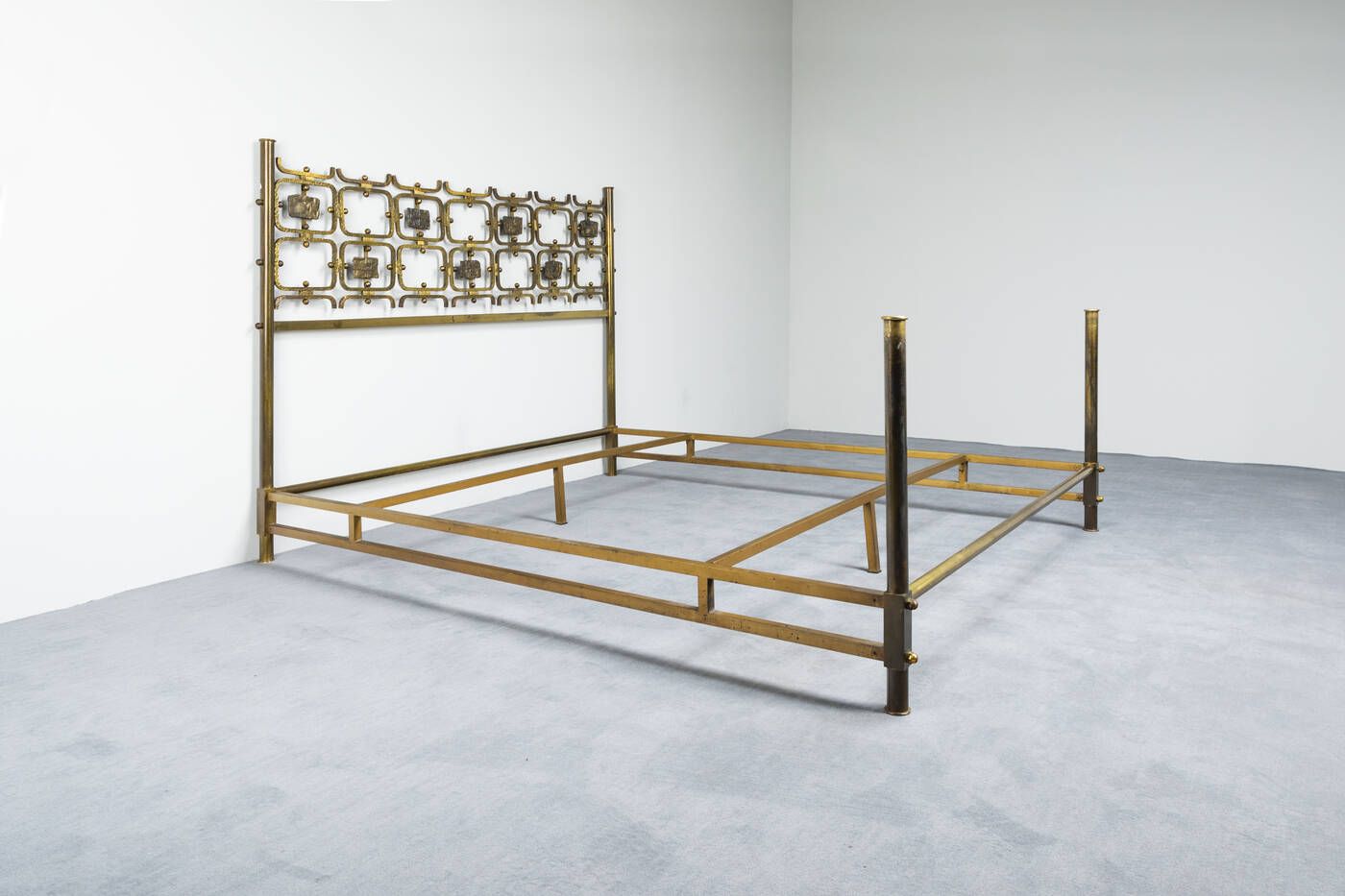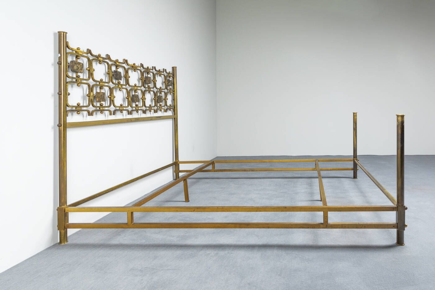 Letto in ottone piatto in acciaio laccato formelle in fusione di ottone di Arnaldo e Gio Pomodoro. Prod. Arredamenti Borsani inizi anni '50 cm 127x202x168