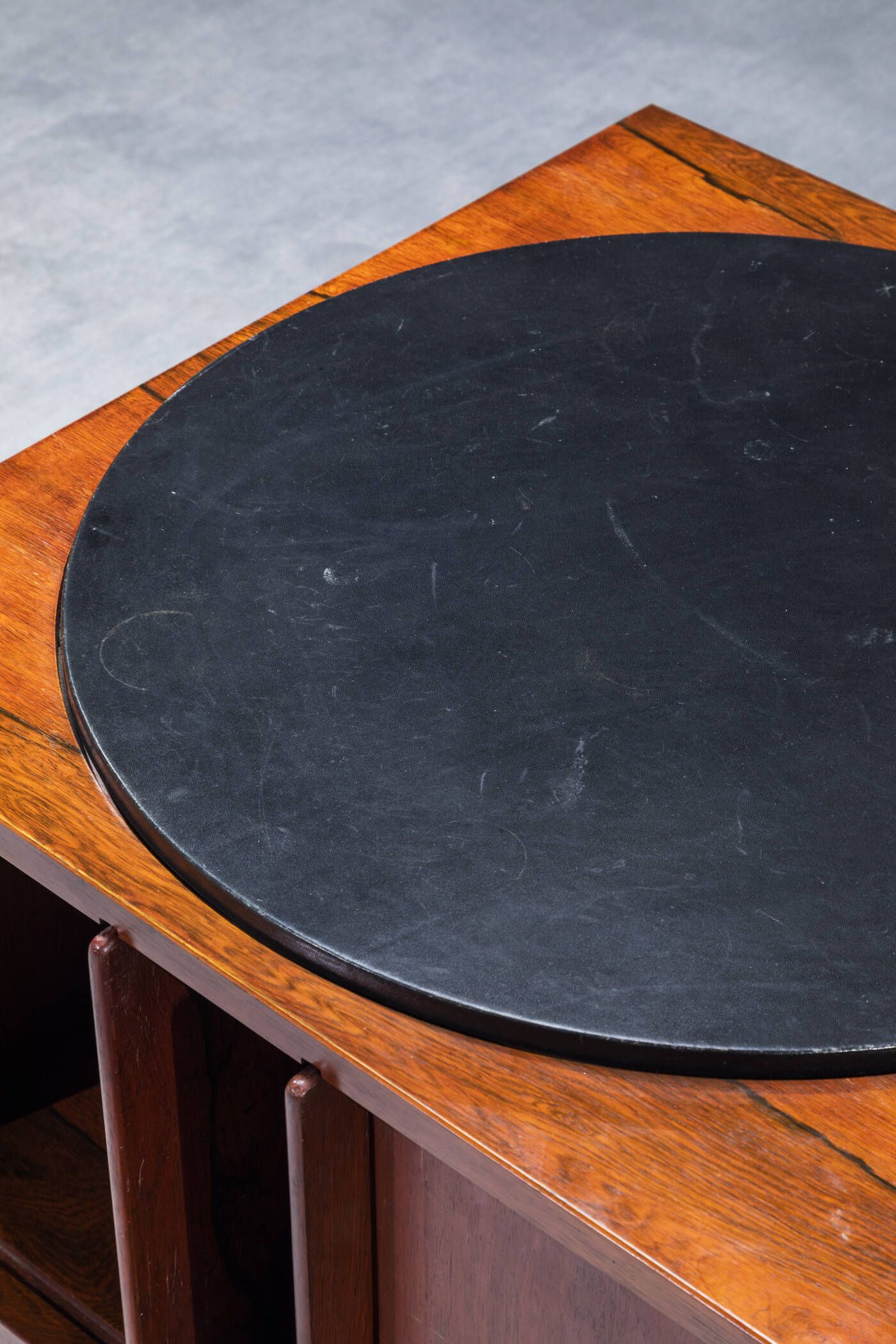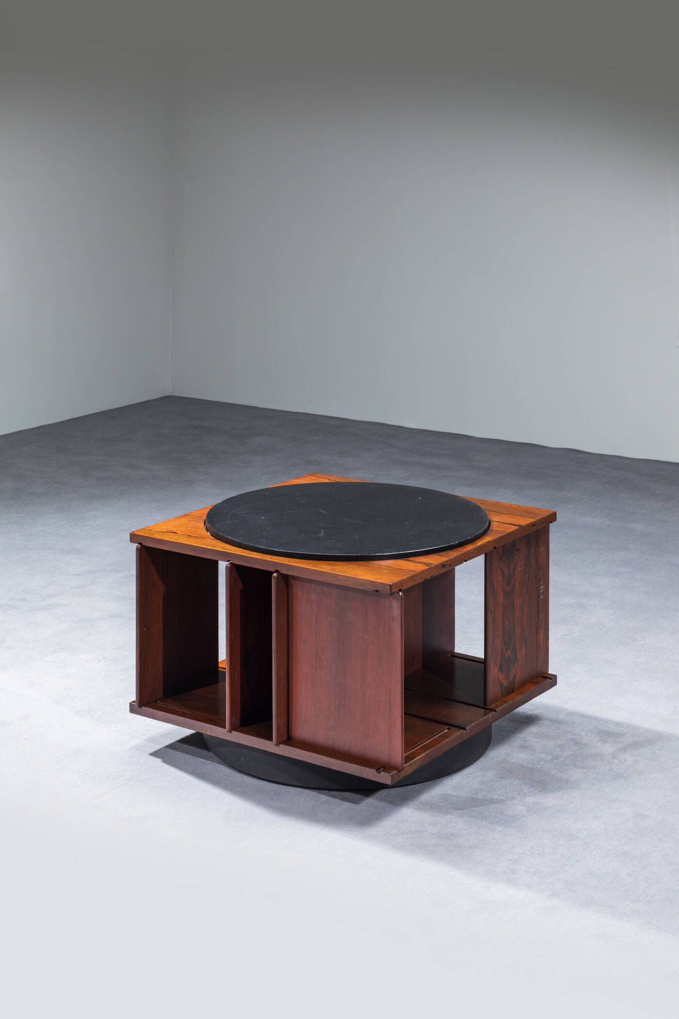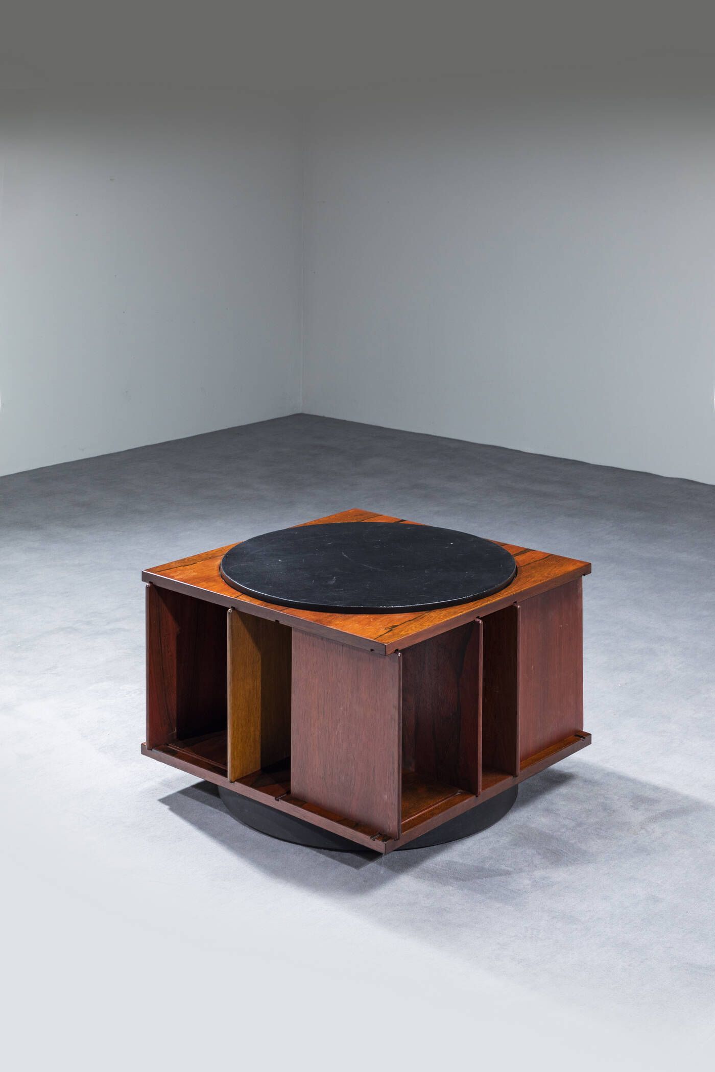 Legno esotico metallo smaltato e pelle. Prod Bernini 1963 cm 50x70x70 Bibl.: Giugliana Gramigna Repertorio del Design Italiano 1950-2000 Allemandi pag.102