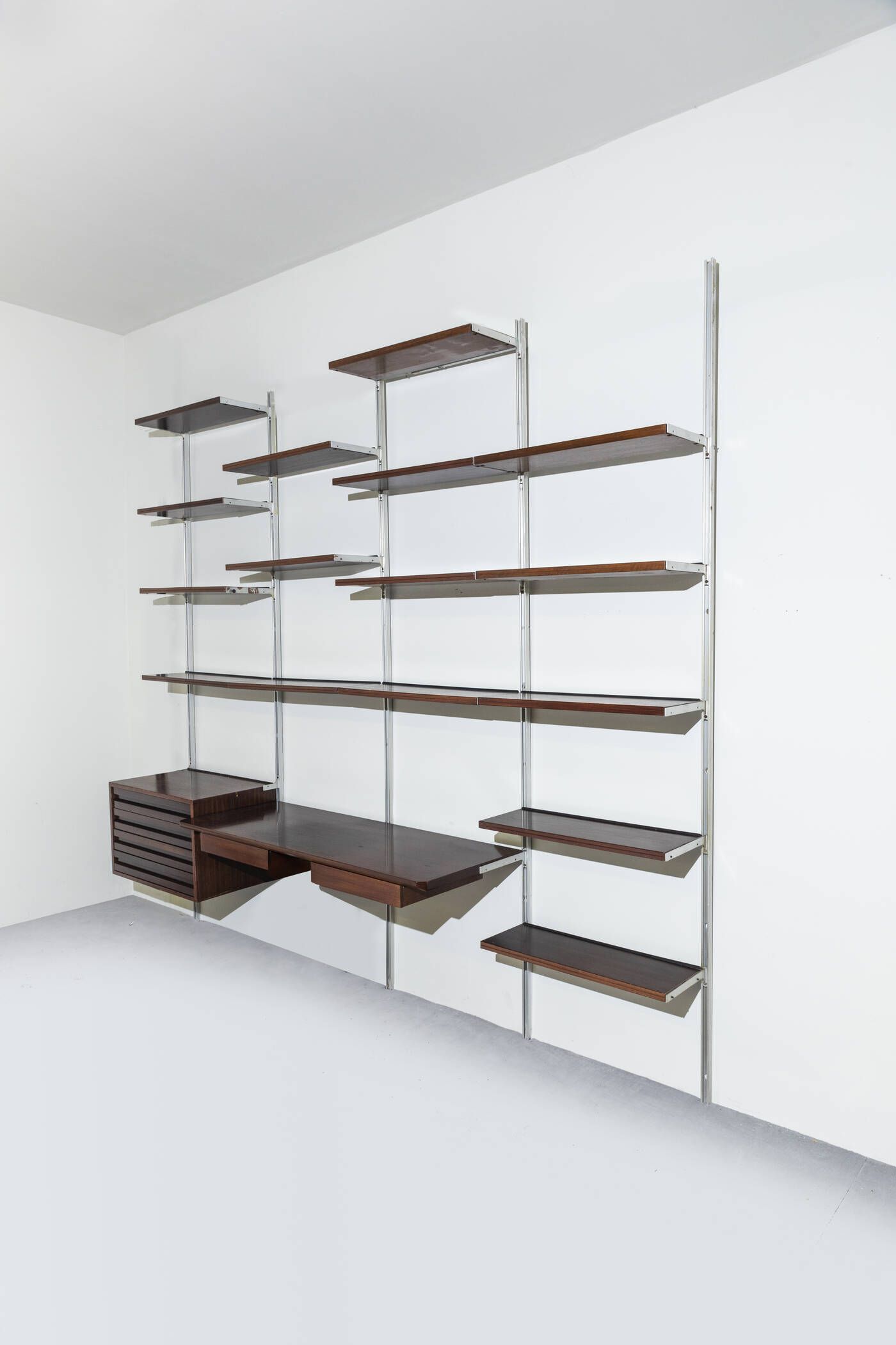 Sistema coordonato di elementi componibili in legno con guide a parete in acciaio. Prod. Tecno anni '60 cm 264x283x58
