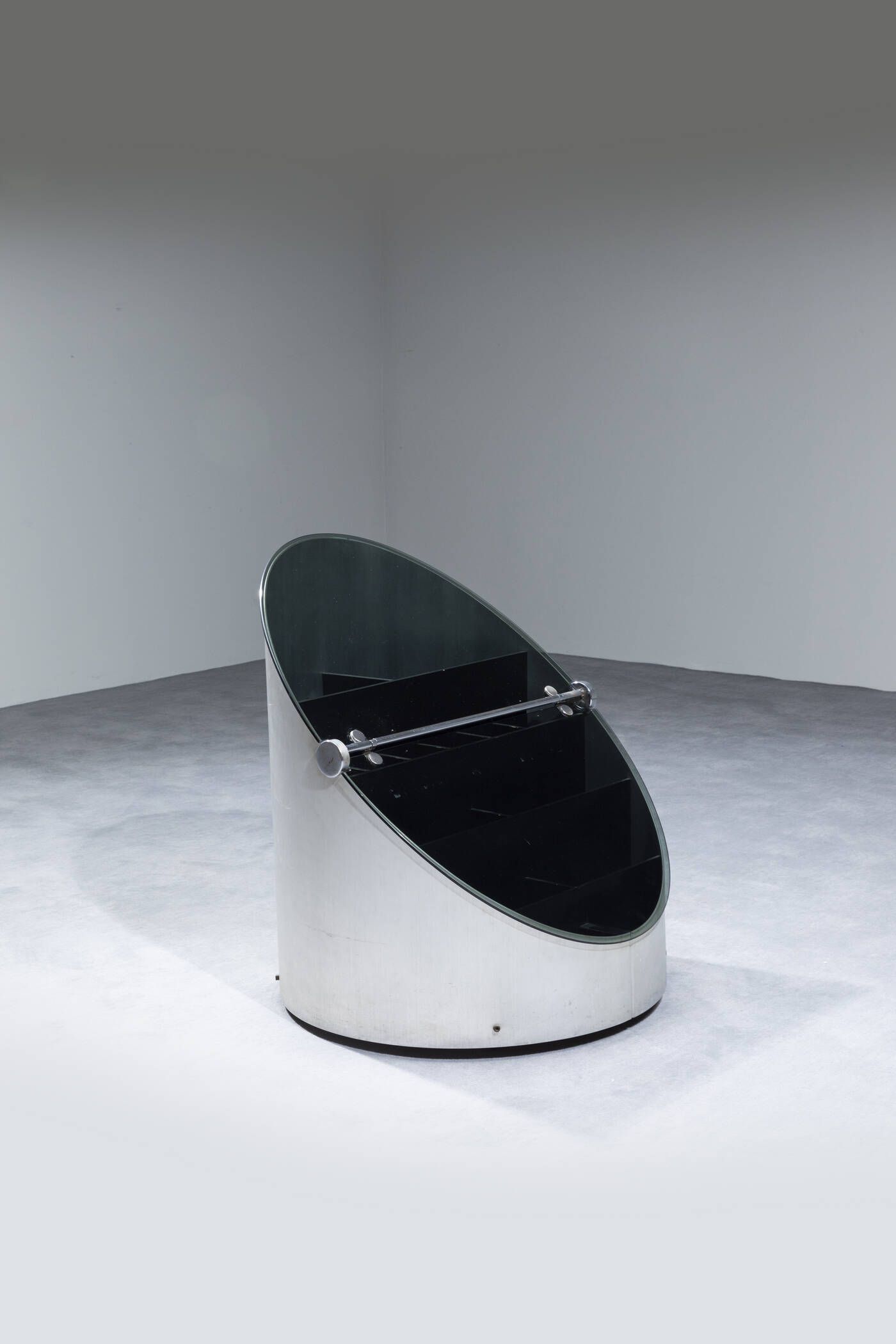 Struttura in alluminio su ruote particolari in acciaio e ante in vetro fumé. Anni '70 cm 73x63 5x65 Difetti