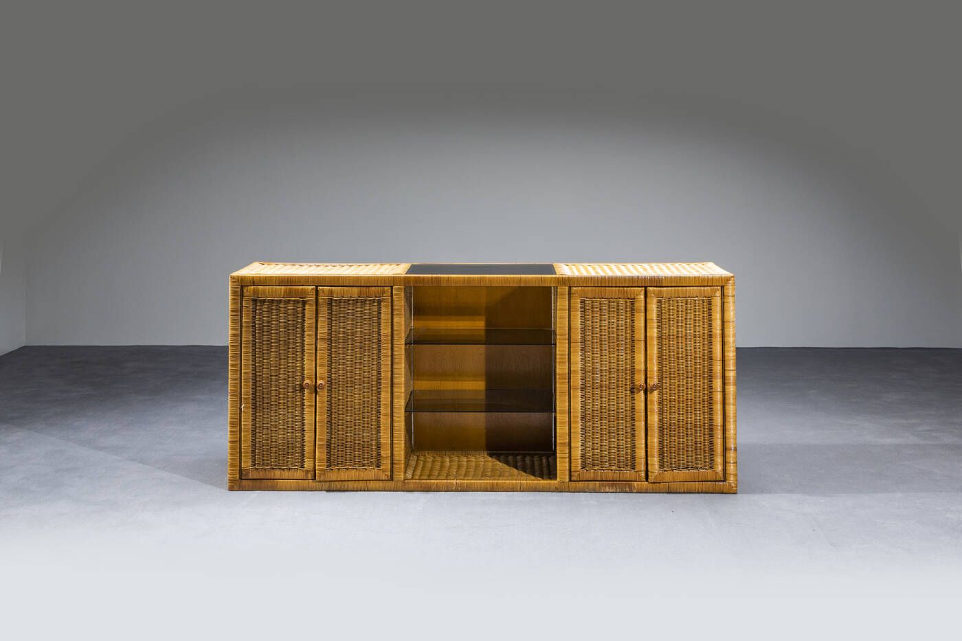 Mobile contenitore in bamboo con piani in vetro. Prod. Vivai del Sud anni '70 cm 84 5x197x41