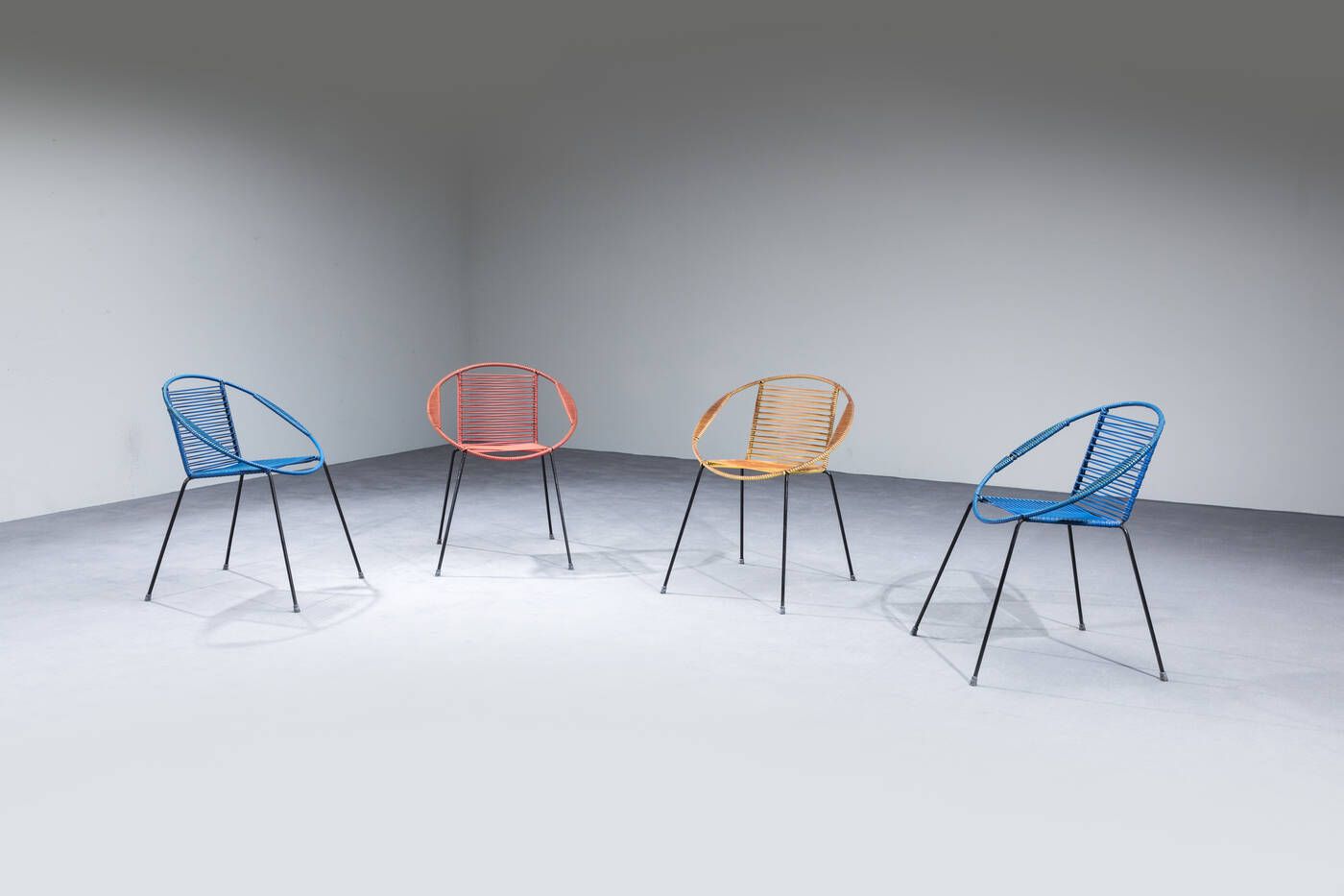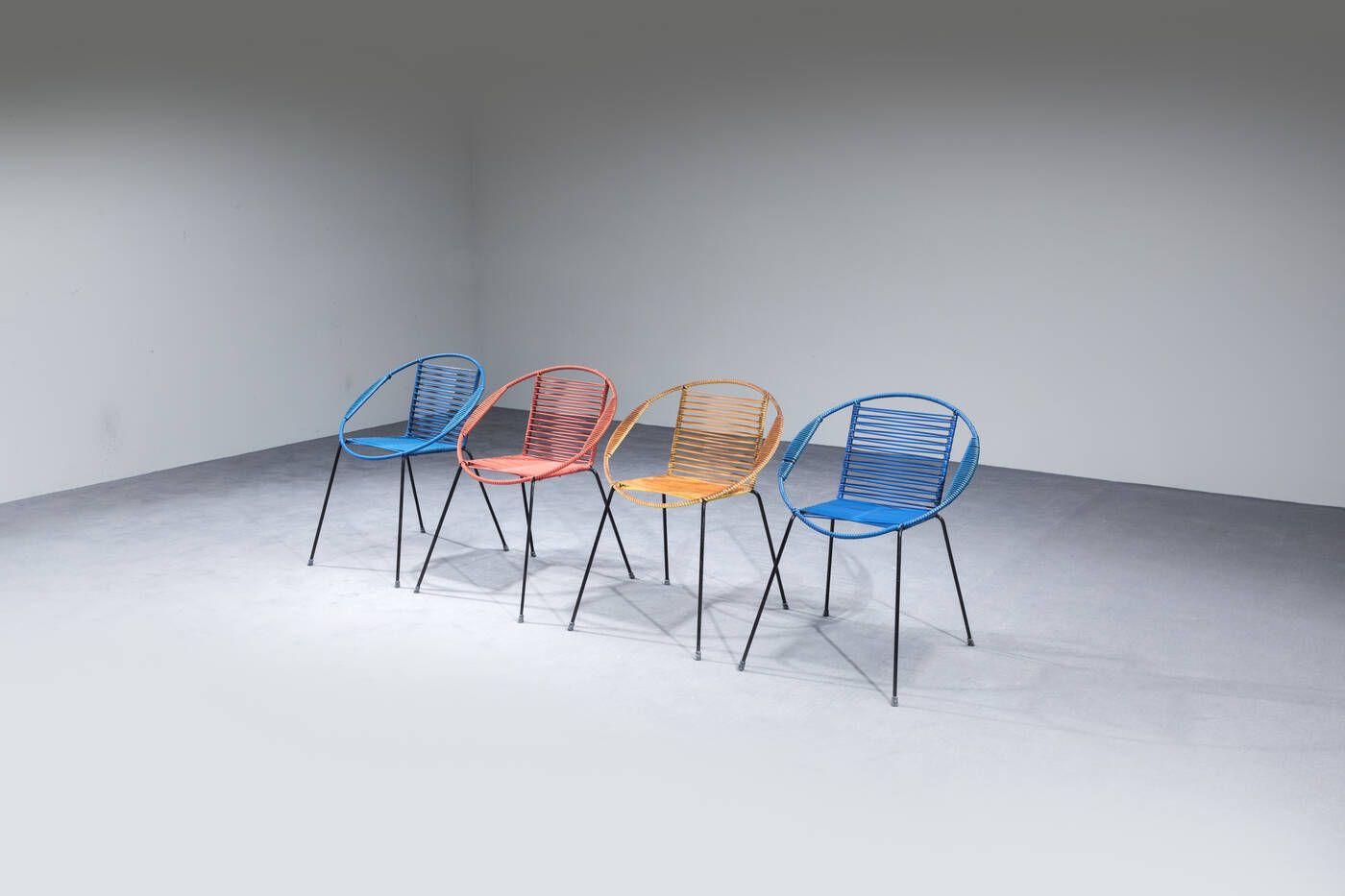 Quattro sedie con struttura in ferro e seduta in materiale plastico. Anni '60 cm [..]