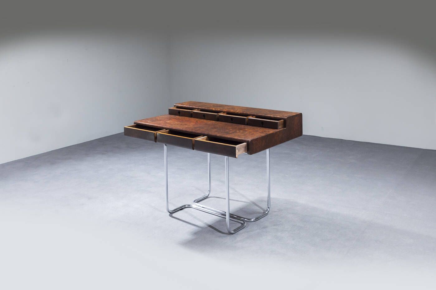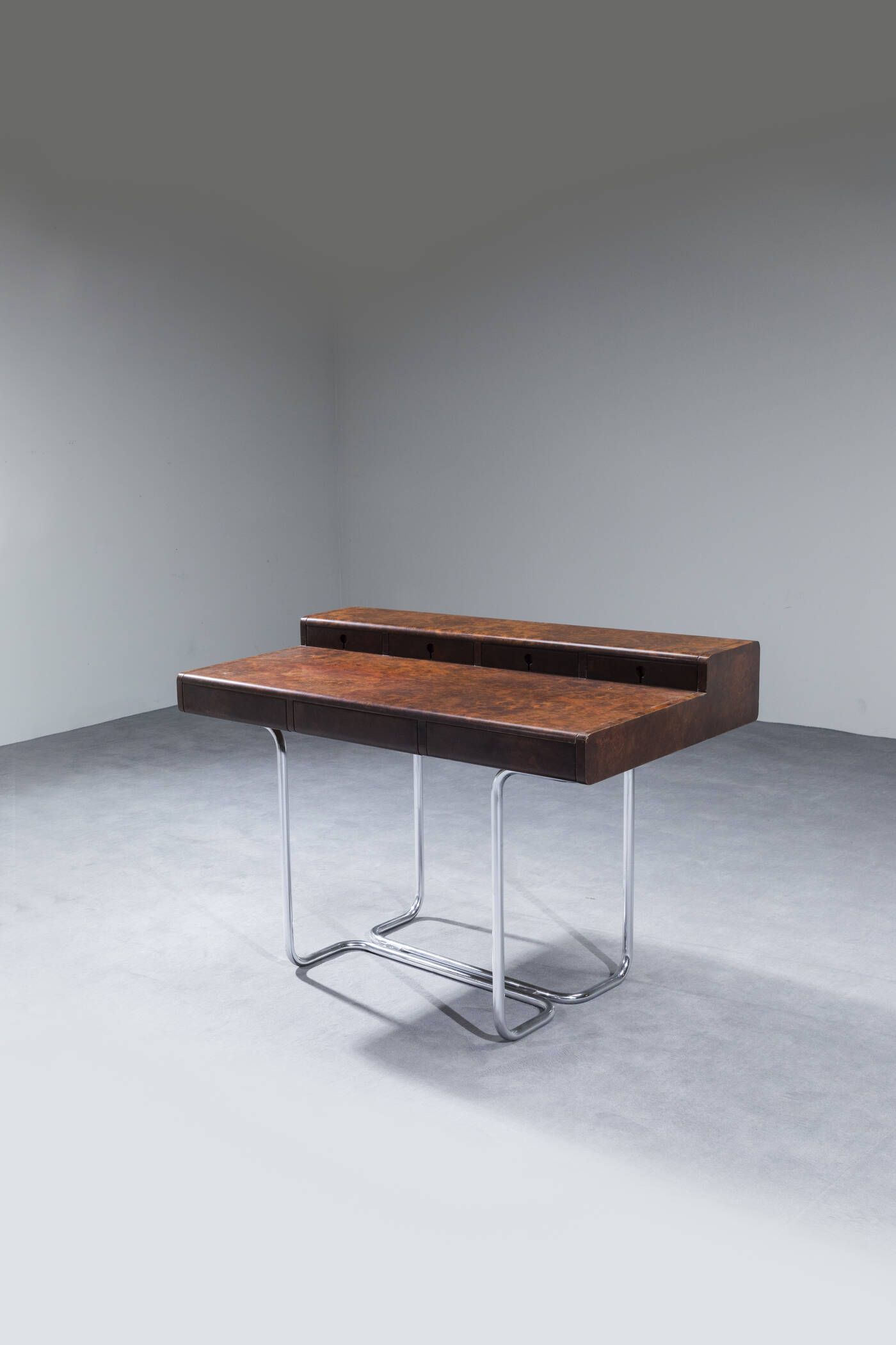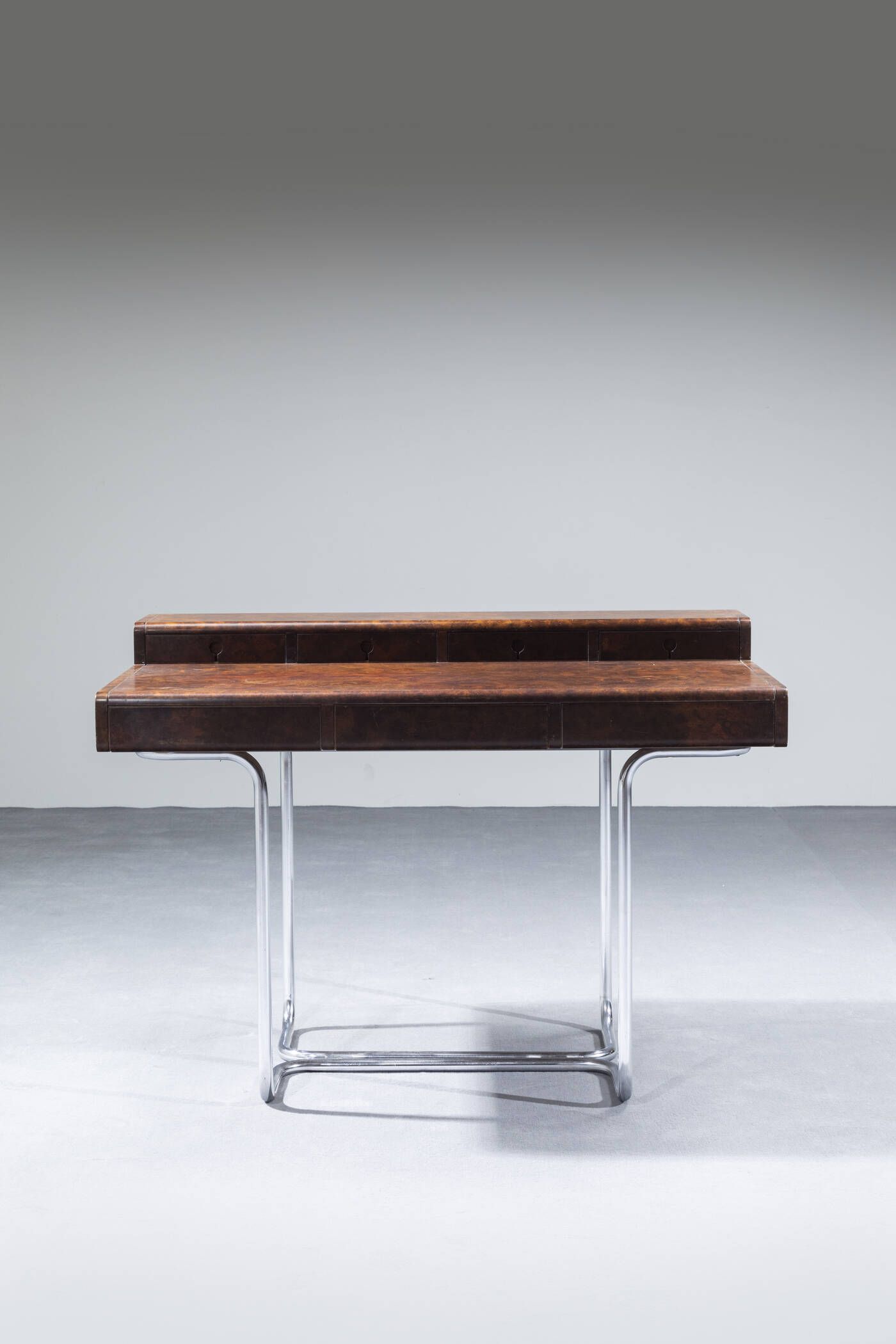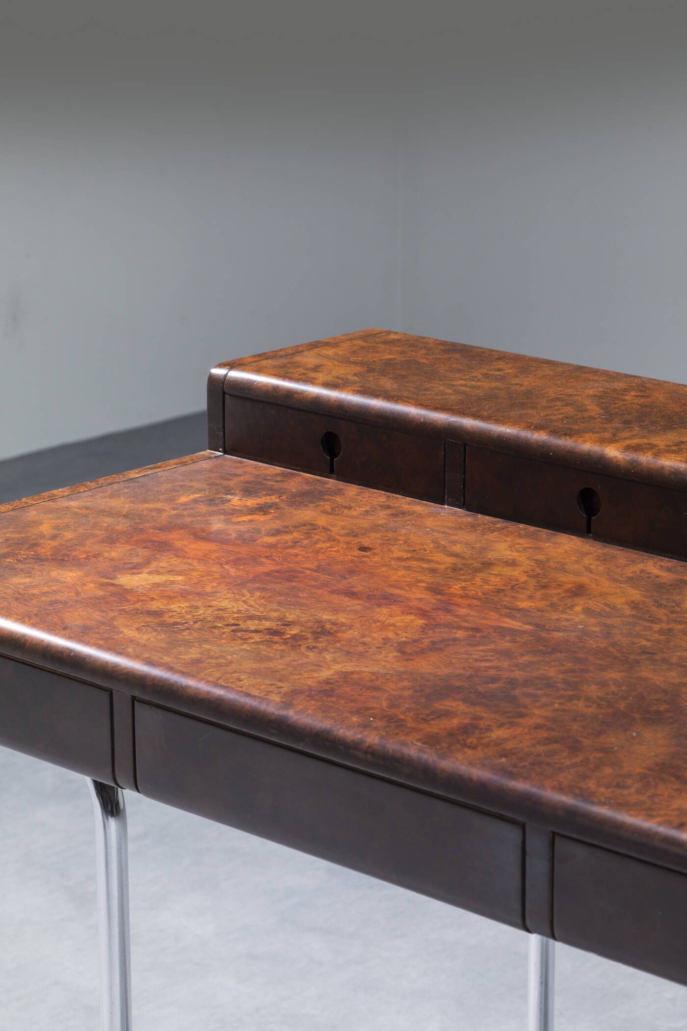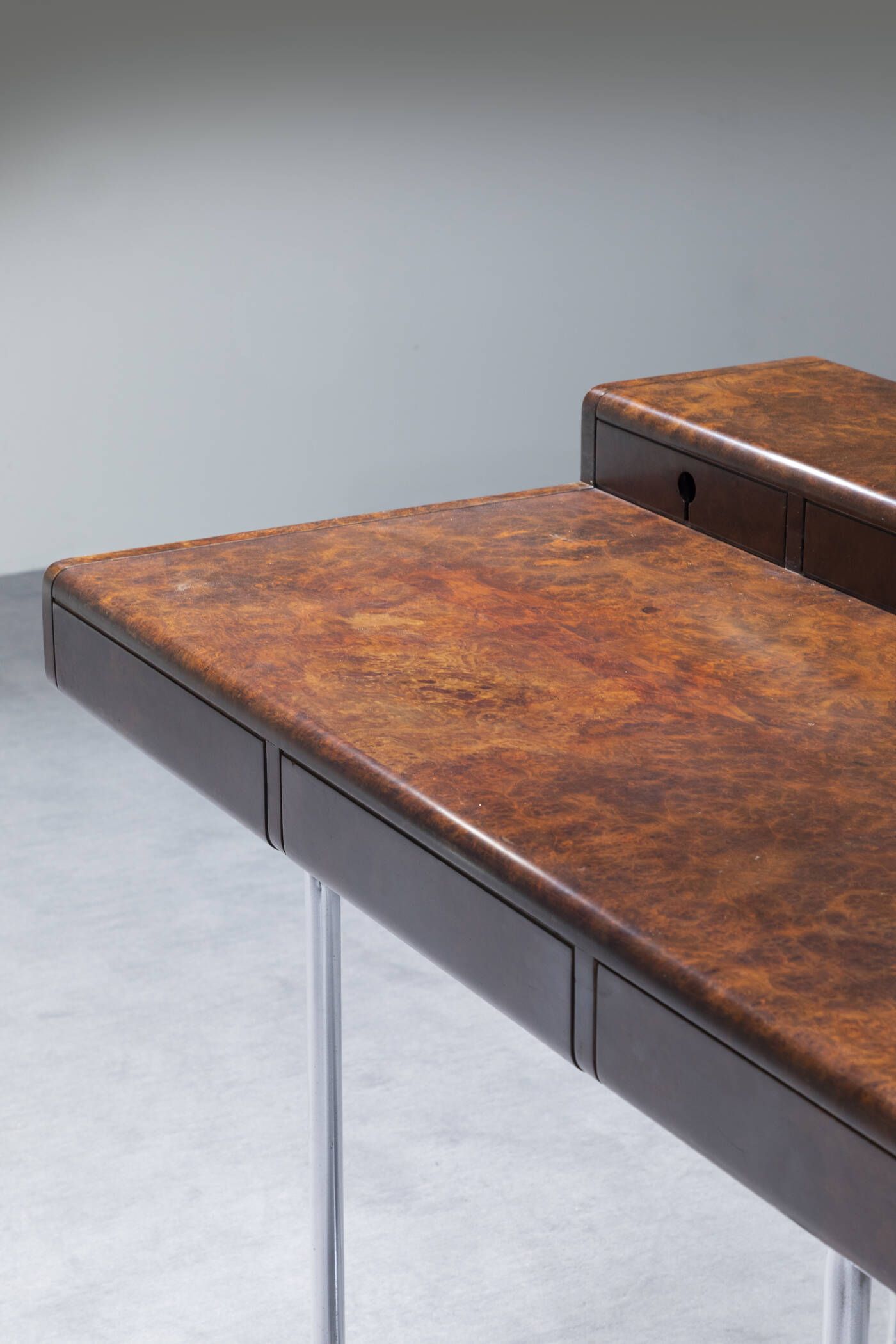 Struttura in metallo cromato e piano in legno di radica impiallaciato. Anni '70 cm 83x116x76 Difetti