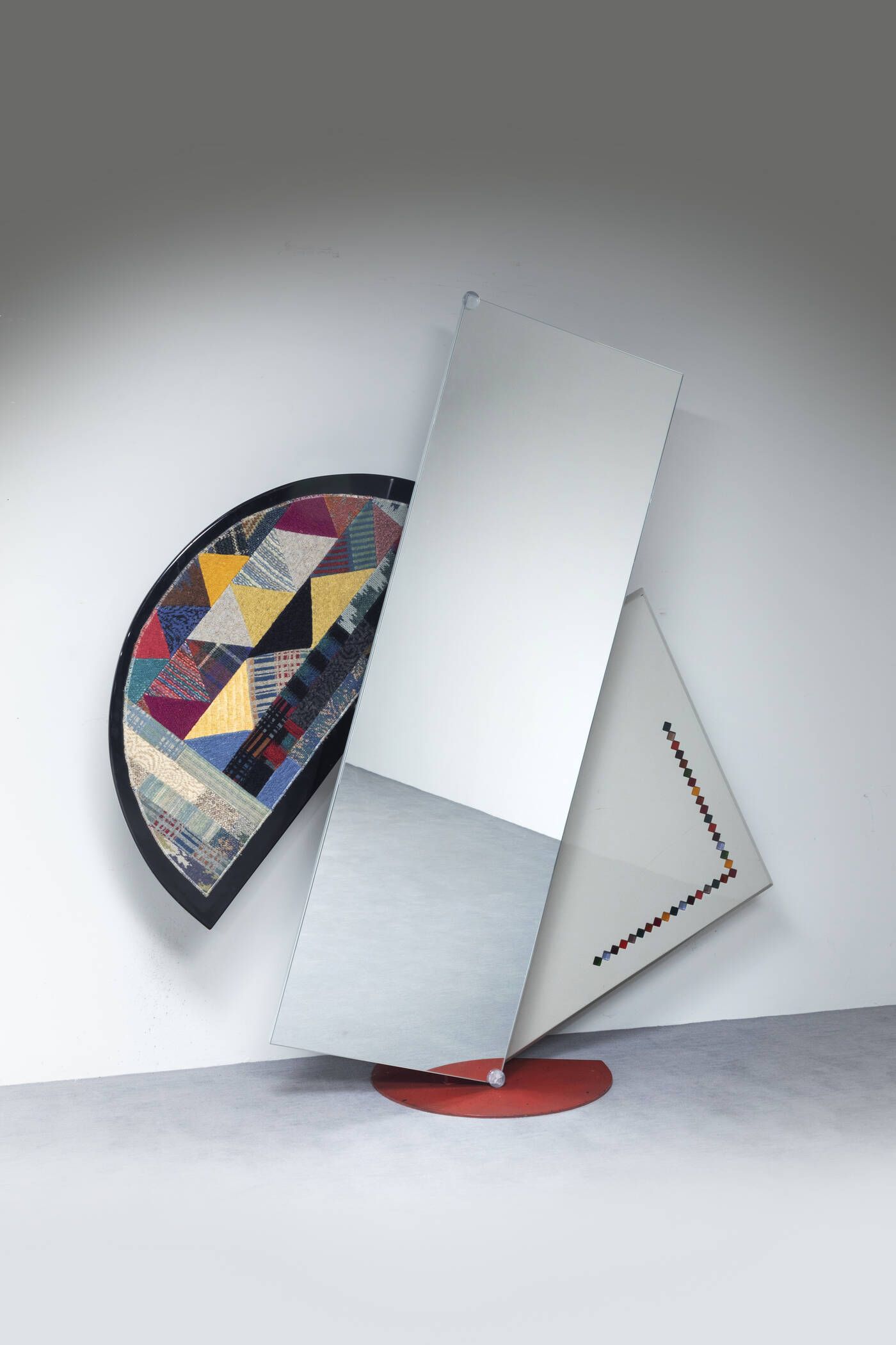 Struttura in ferro verniciato con elementi in legno laccato e tappeto applicato su uno degli elementi. Prod. Saporiti anni '70 Missoni (in collaborazione) cm 192x175x46 Difetti