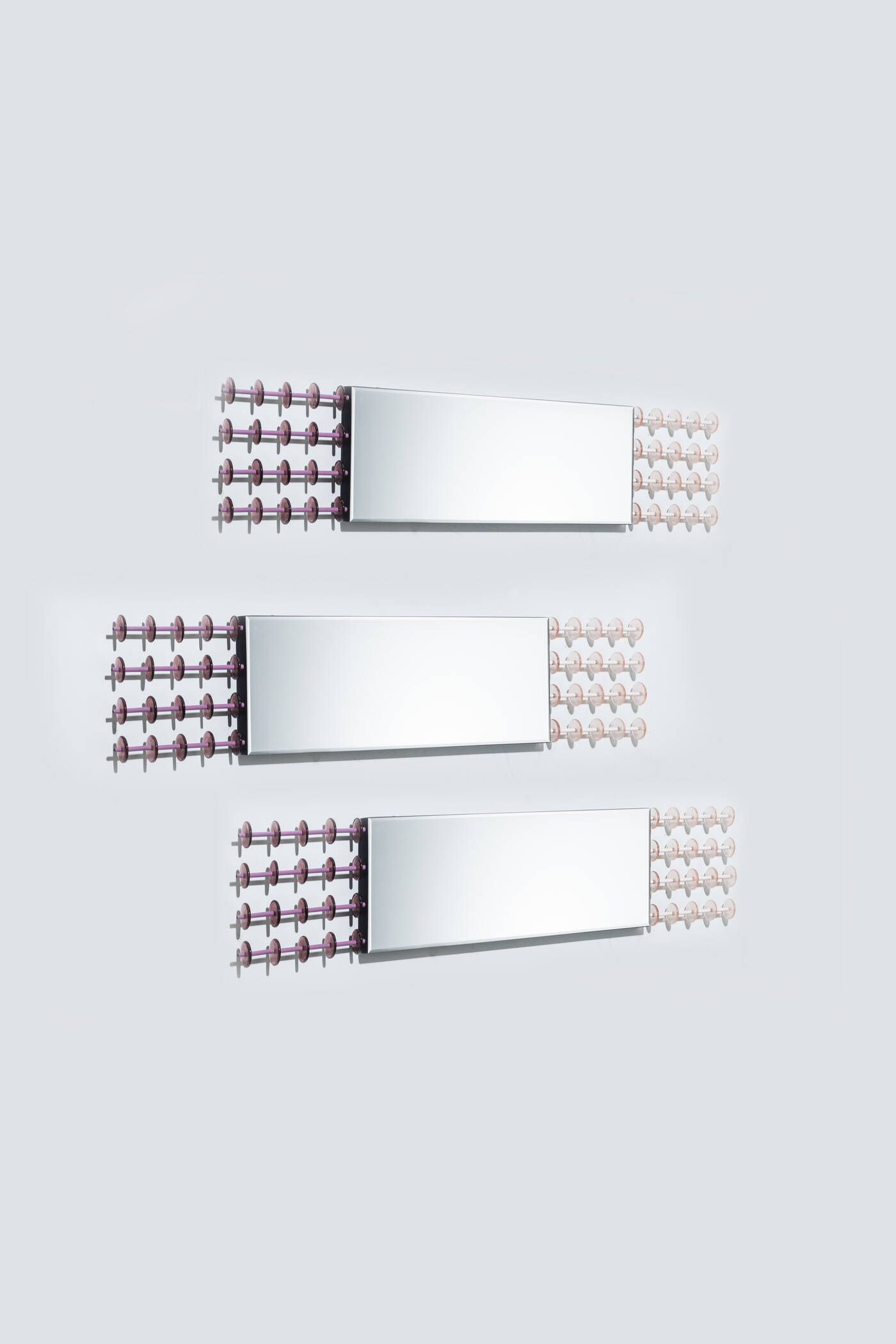 Specchio composto da tre elementi con struttura in legno ed elementi decorativi in vetro di Murano e metallo laccato. Etichetta cartacea del Produttore recante la firma dell'artista Prod. Salir anni '80 cm 21x95 ogni elemento