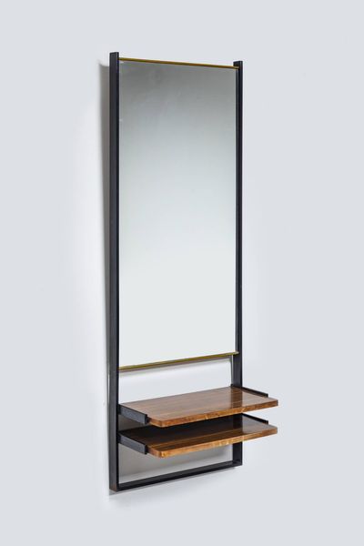 Specchio con struttura in ferro particolari in ottone e mensole in legno. Anni [..]