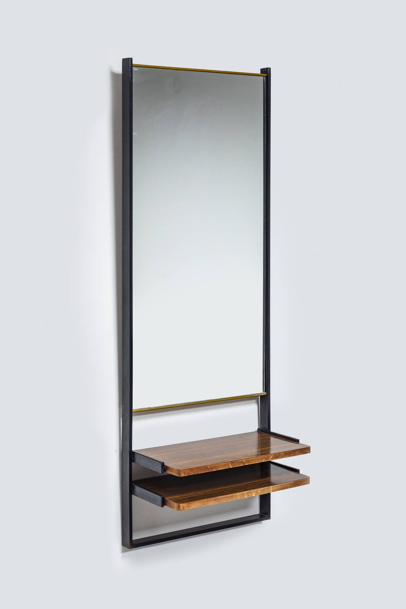 Specchio con struttura in ferro particolari in ottone e mensole in legno. Anni '50 cm 135 5x50x25