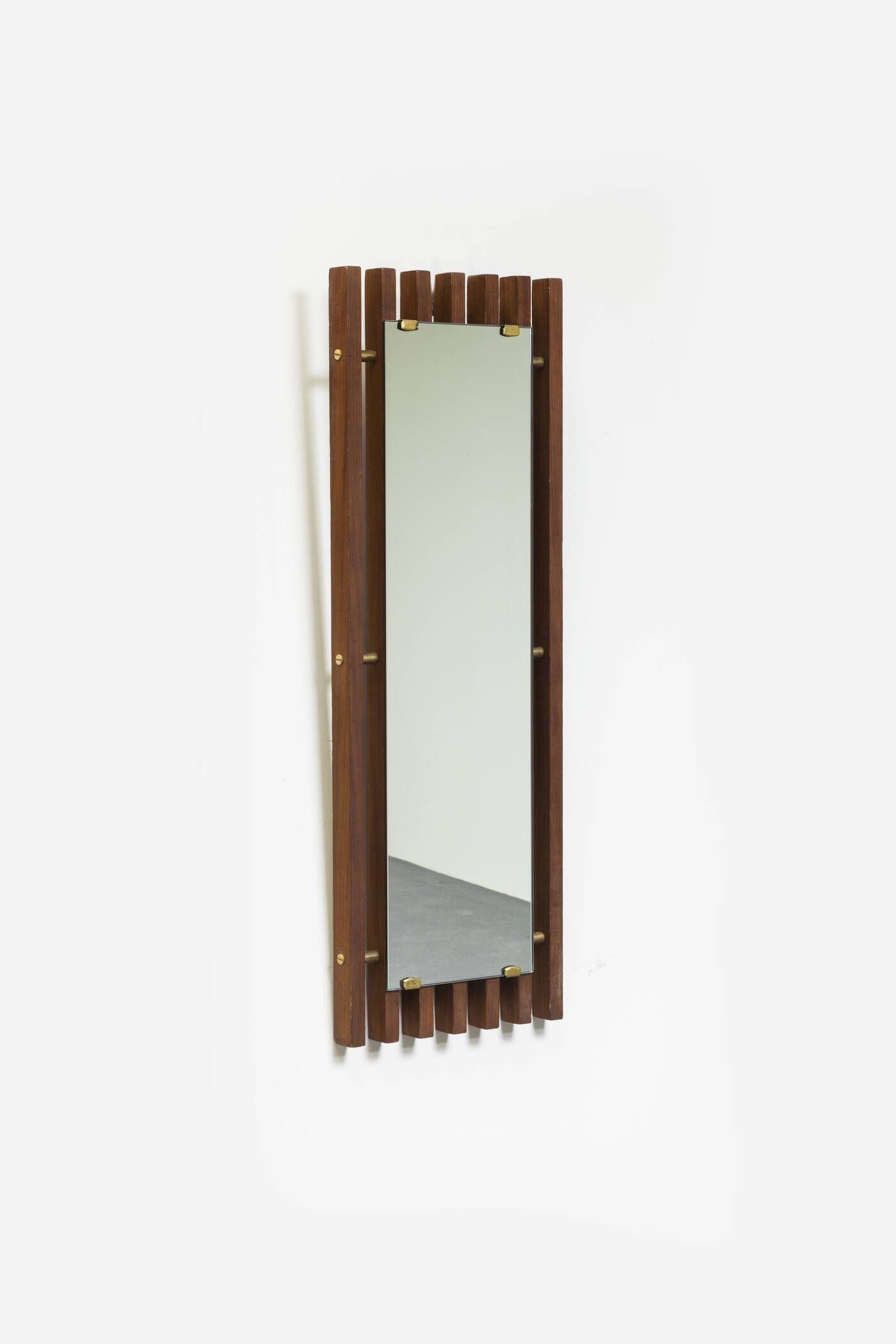 Specchio con struttura listellare in legno e ottone cristallo specchiato. Anni '60 cm 92x41