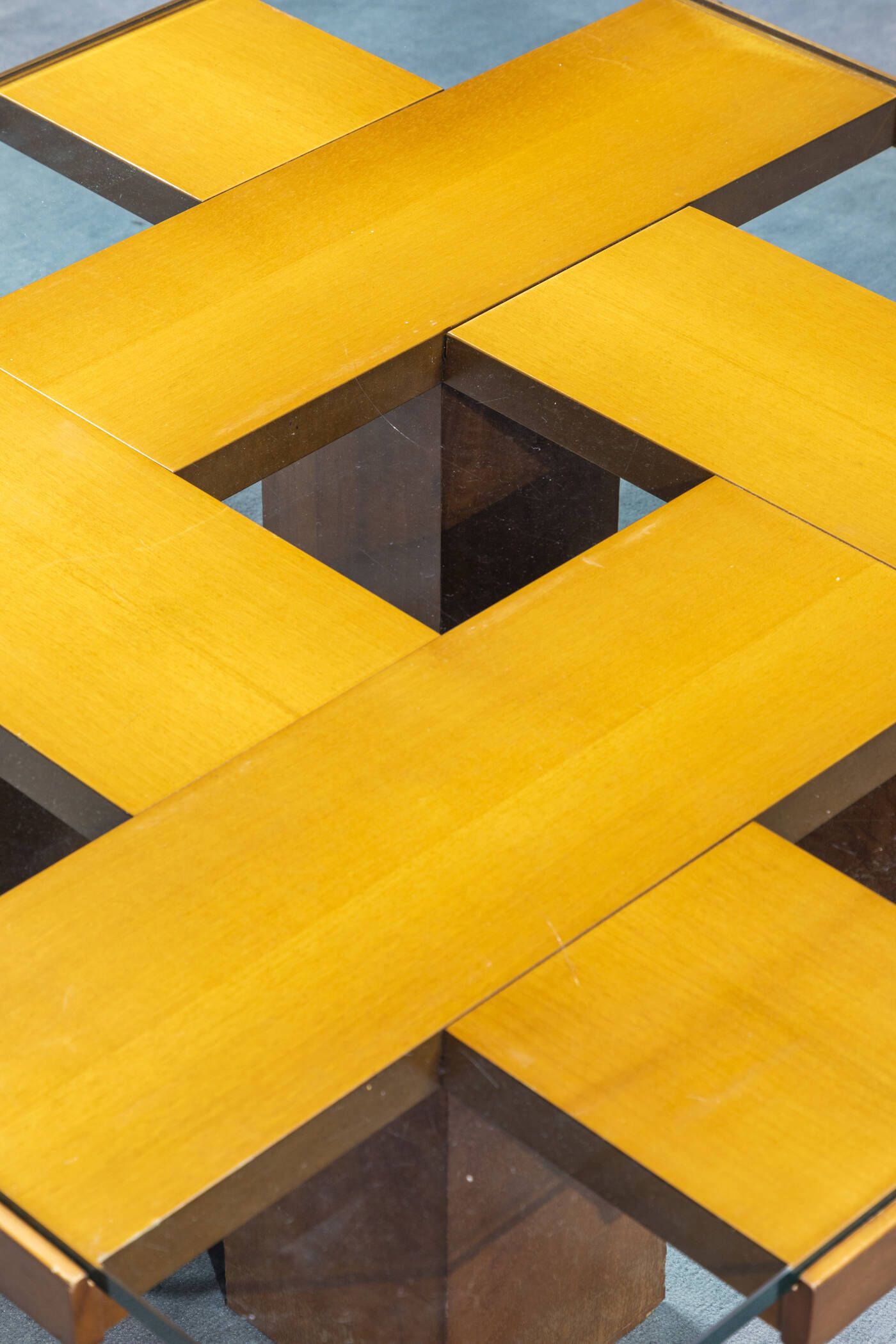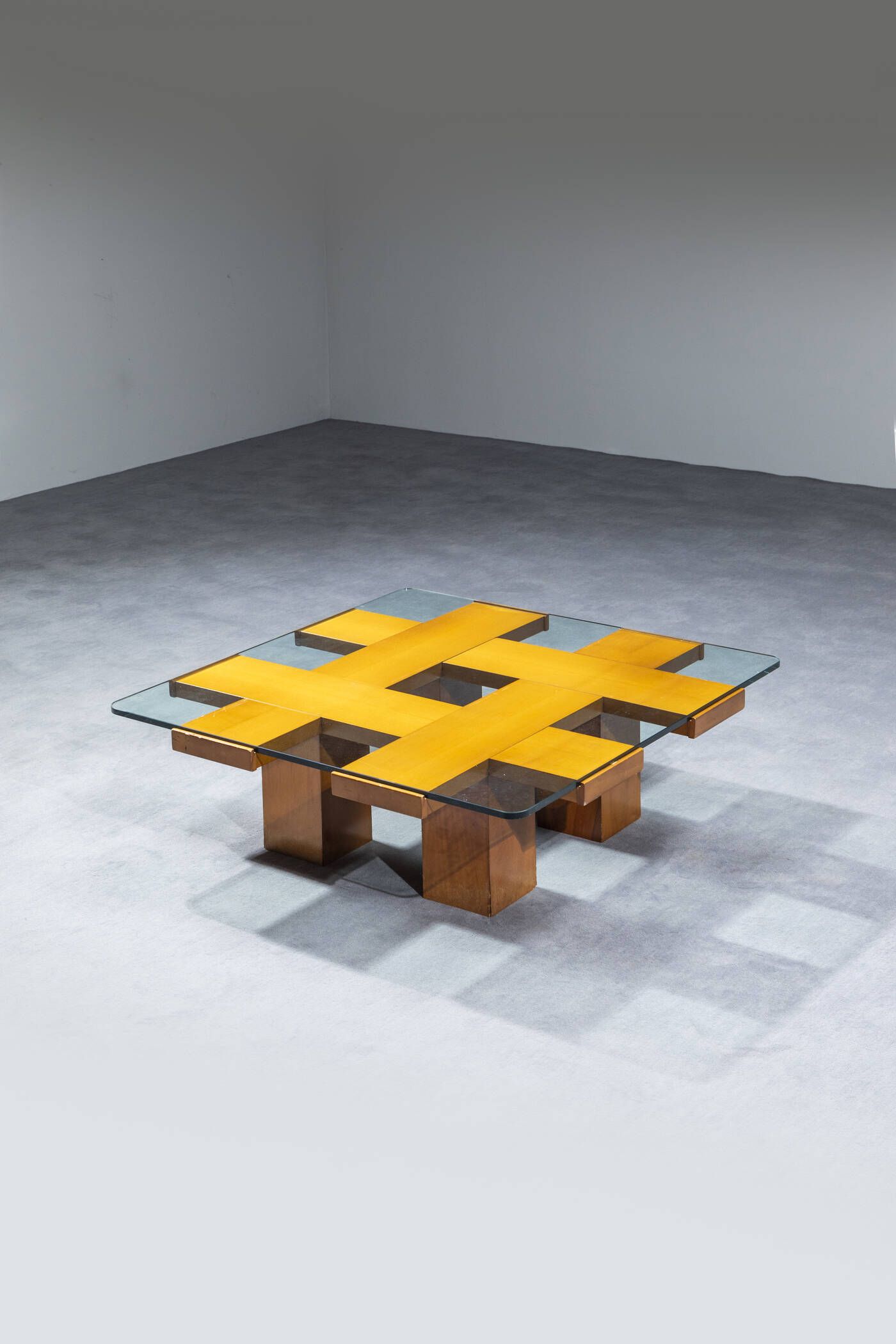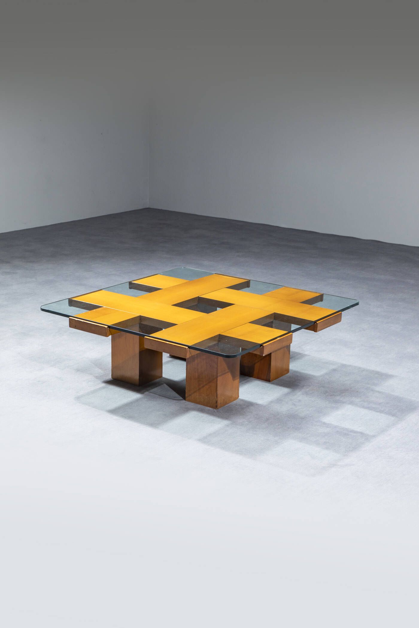 Tavolino con struttura in legno e piano in vetro. Anni '70 cm 30x91x91
