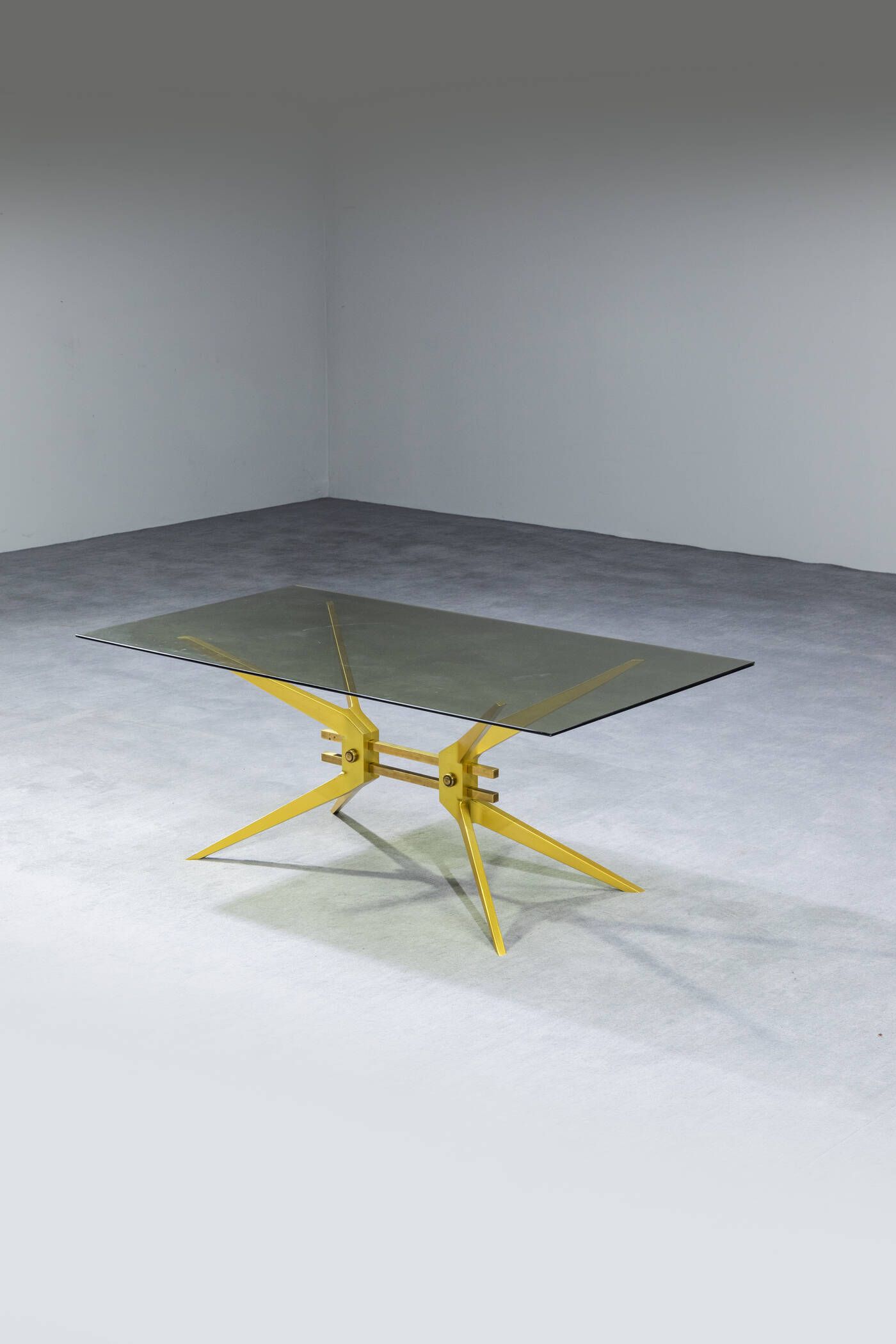 Tavolino con struttura in ottone piano in vetro fumé. Anni '50 cm 40x100x54
