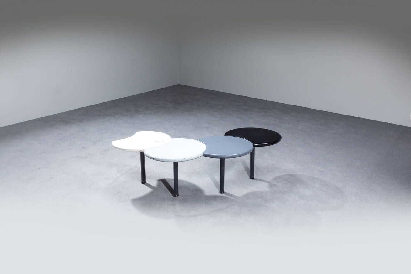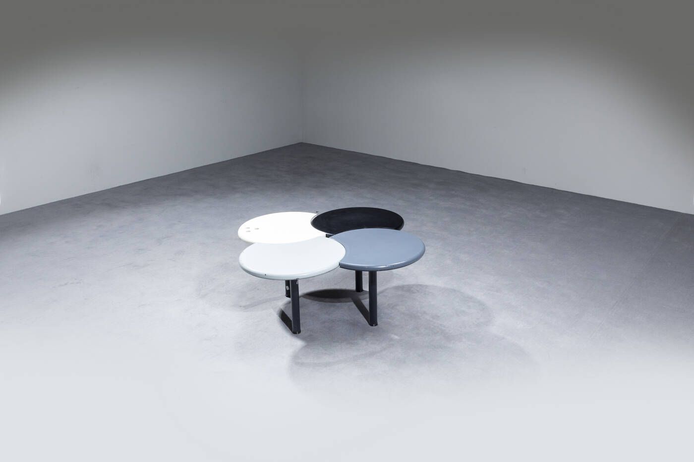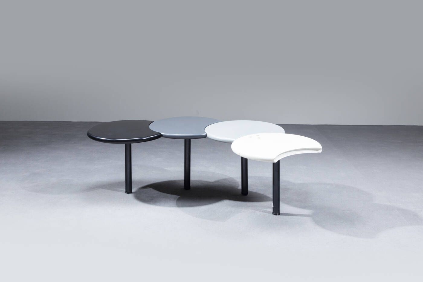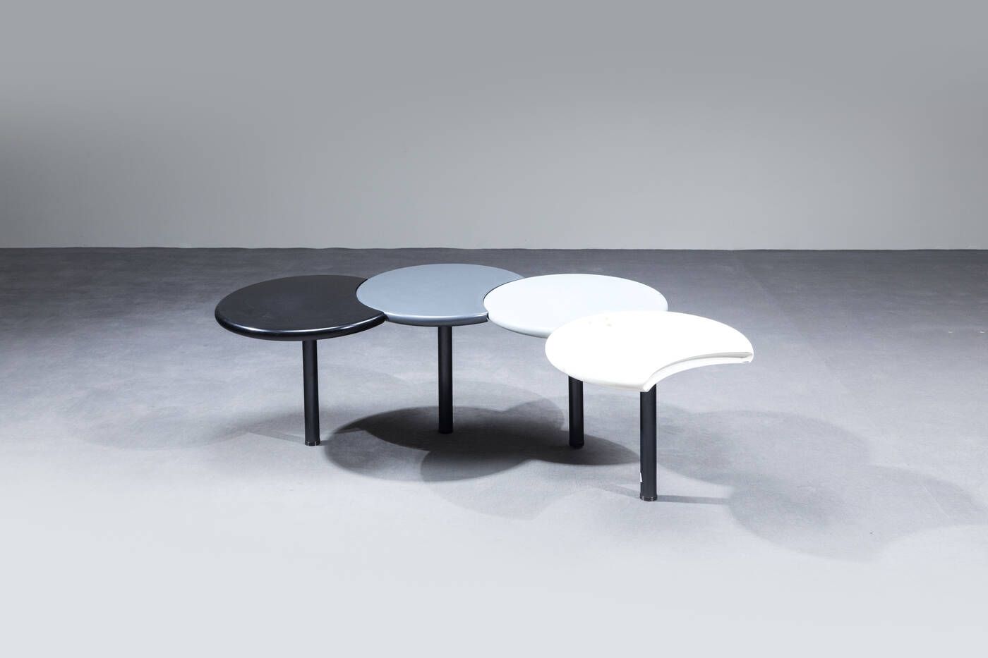 Tavolino in legno laccato formato da quattro cerchi mobili poggianti su basi in [..]