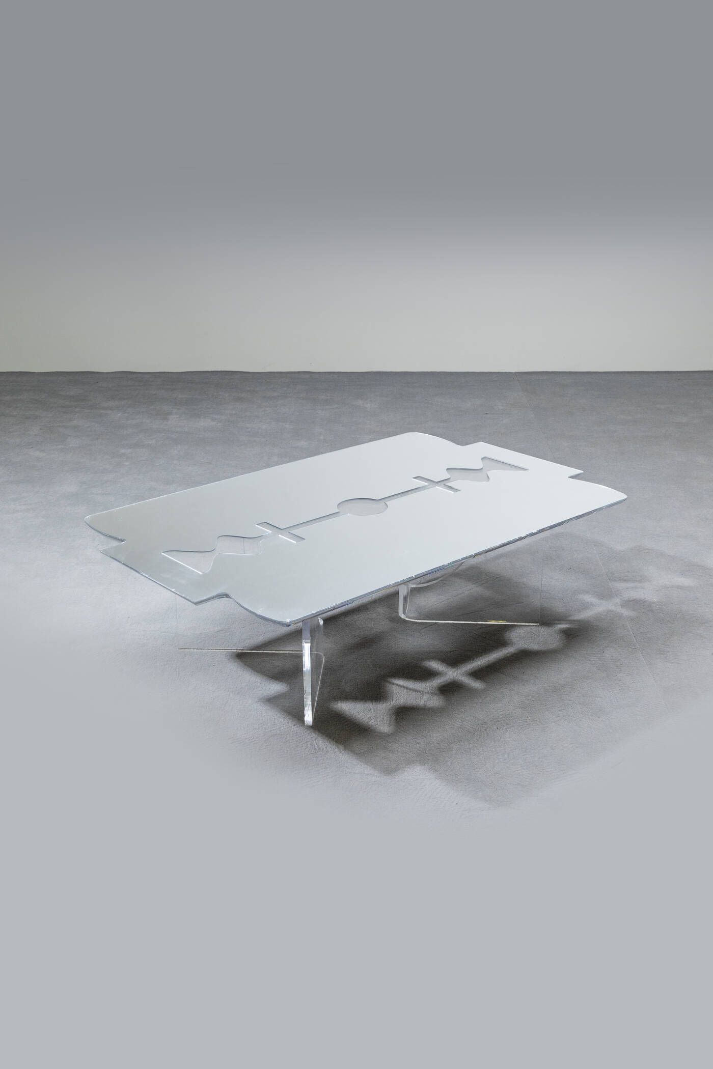 Tavolino in plexiglass. Firma dell'artista sulla base e numerazione 1 di 8 Anni 2000 cm 36x127x79 5