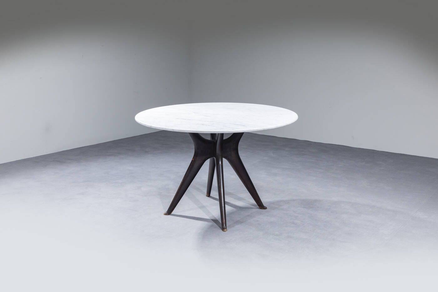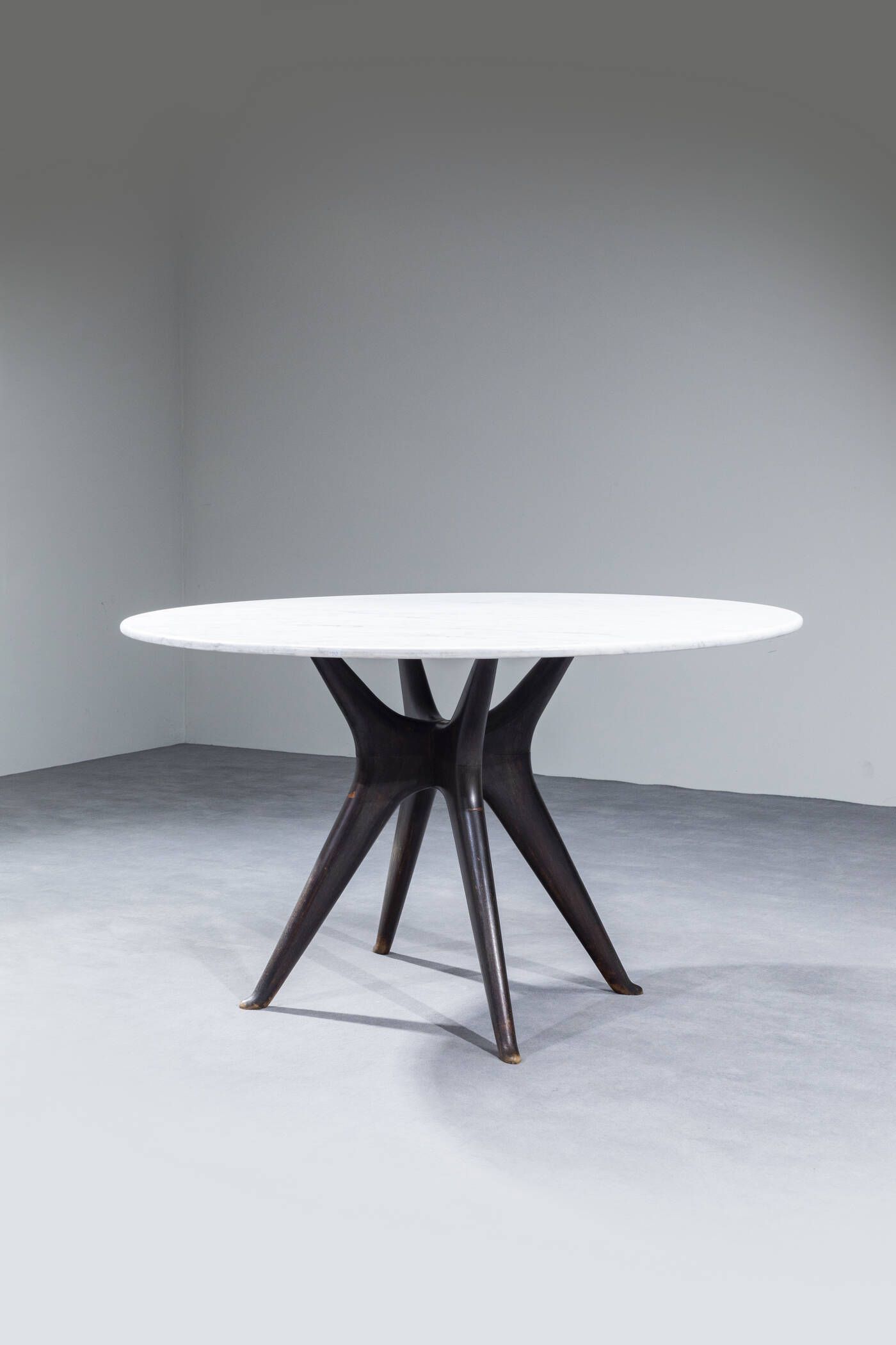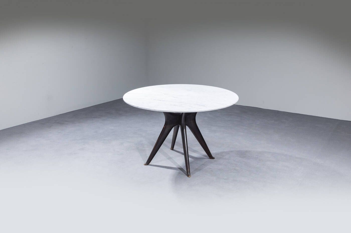 Tavolo con struttura in legno e piano rotondo in marmo bianco. Anni '50 cm 75x125 5
