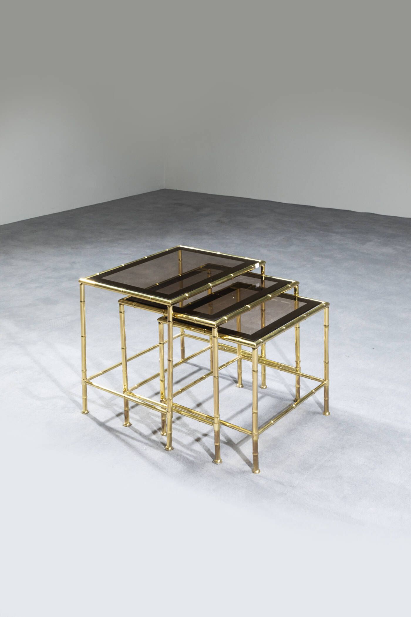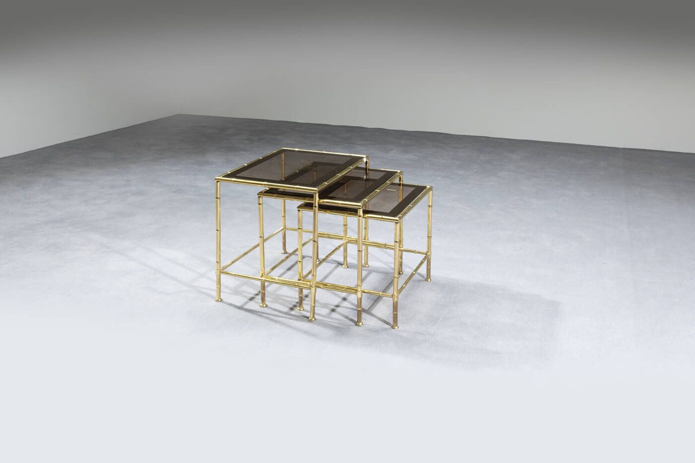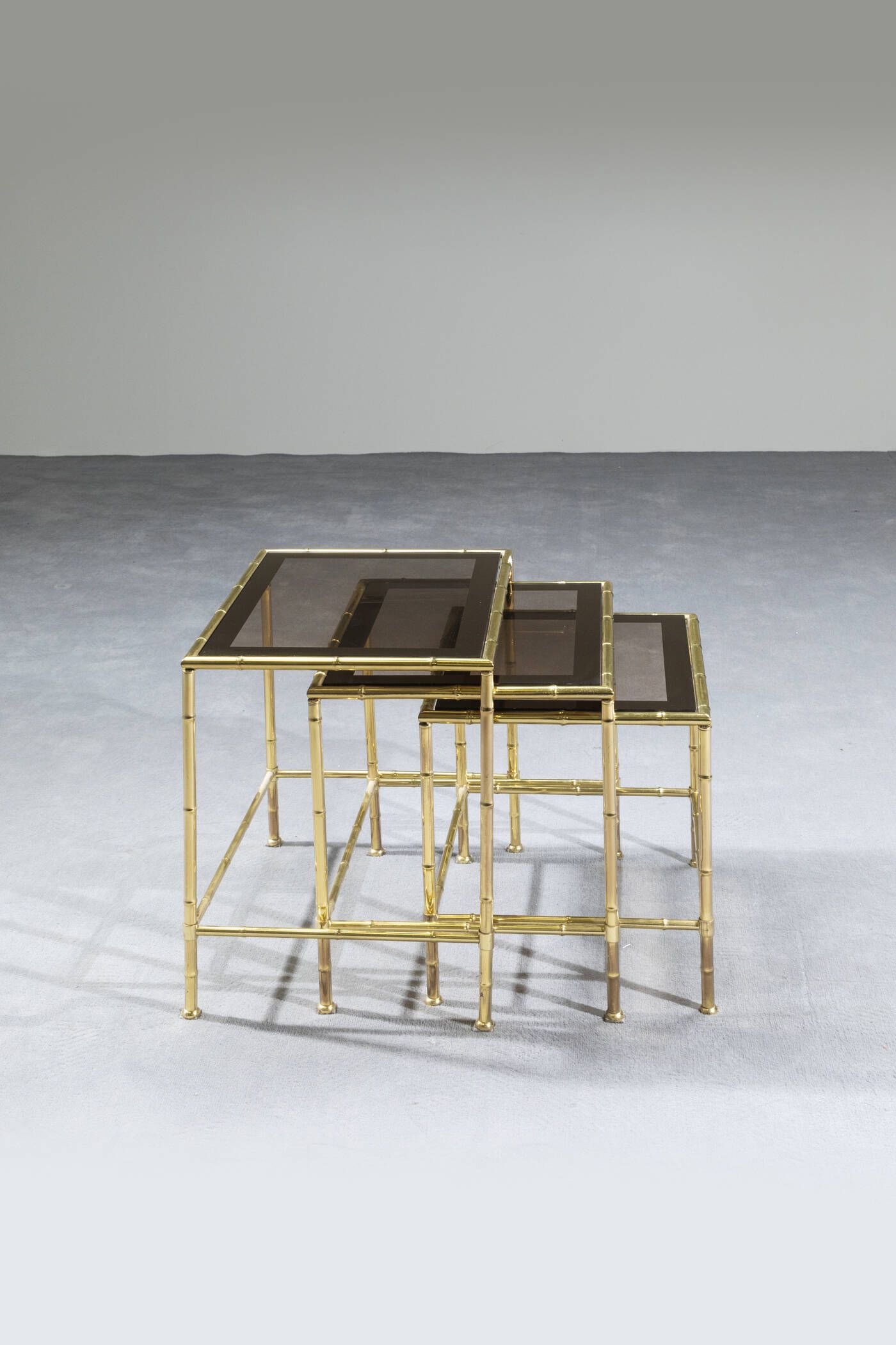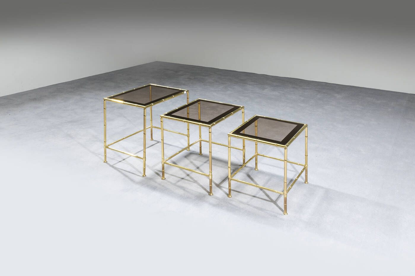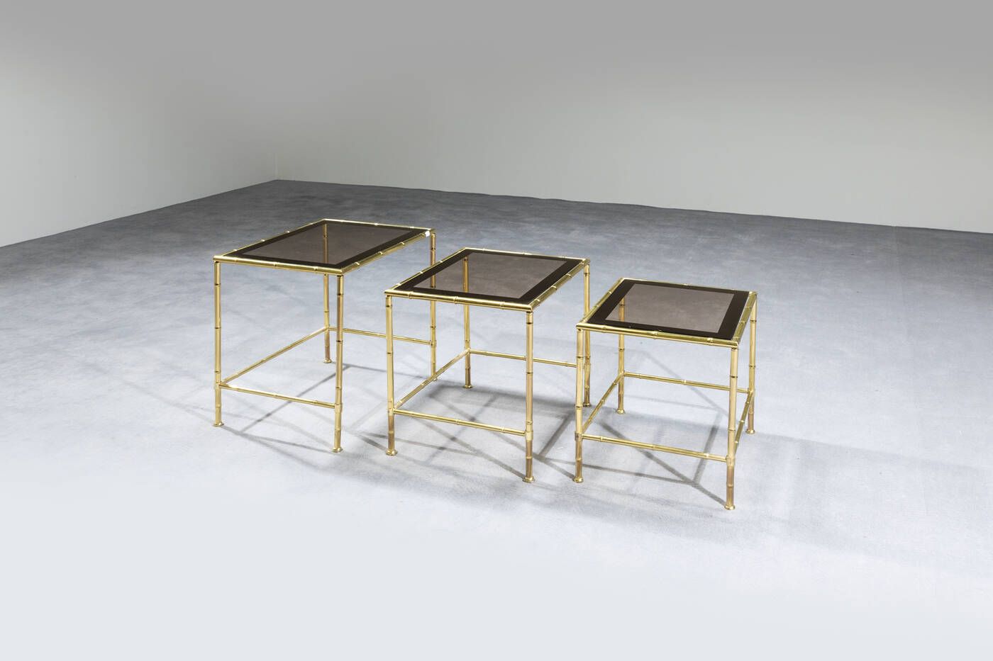 Tre tavolini con struttura in ottone e piano in vetro. Anni '70 cm 46x39x52 cm 42 5x47x38 cm 38 7x42 5x36 5