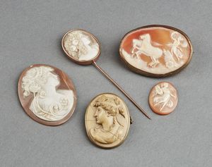 Gruppo di cinque cammei in calcedonio, agata, conchiglia e pietra lavica raffiguranti [..]