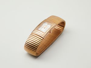 Orologio in acciaio dorato con maglia elastica con movimento al quarzo.