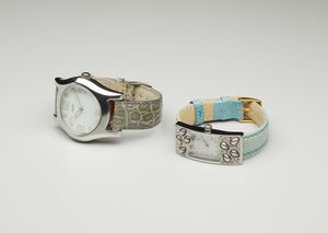 Due orologi in metallo cromato e dorato con cinturini in ecopelle