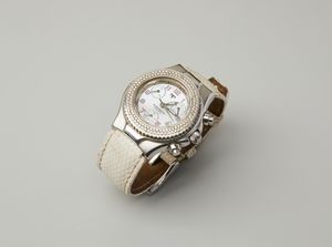 Orologio femminile in acciaio con strass e cinturino in similpelle bianca.