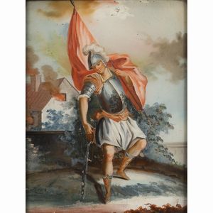 25x20 cm. XVIII-XIX Sec. Soldato con stendardo ed anfora, dipinto sottovetro