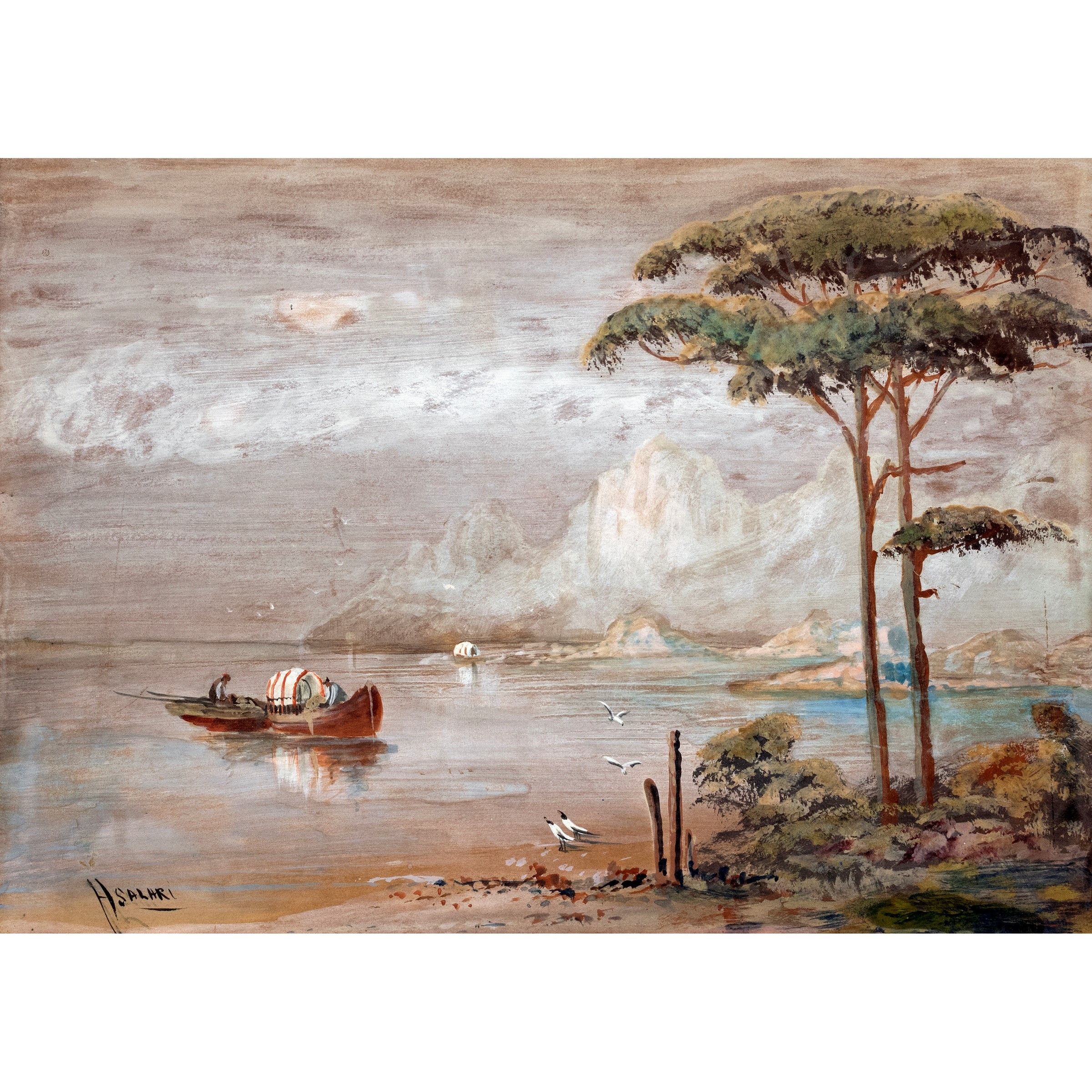 XX Sec. Marina con figure, acquarello su carta, firmato in basso a sinistra