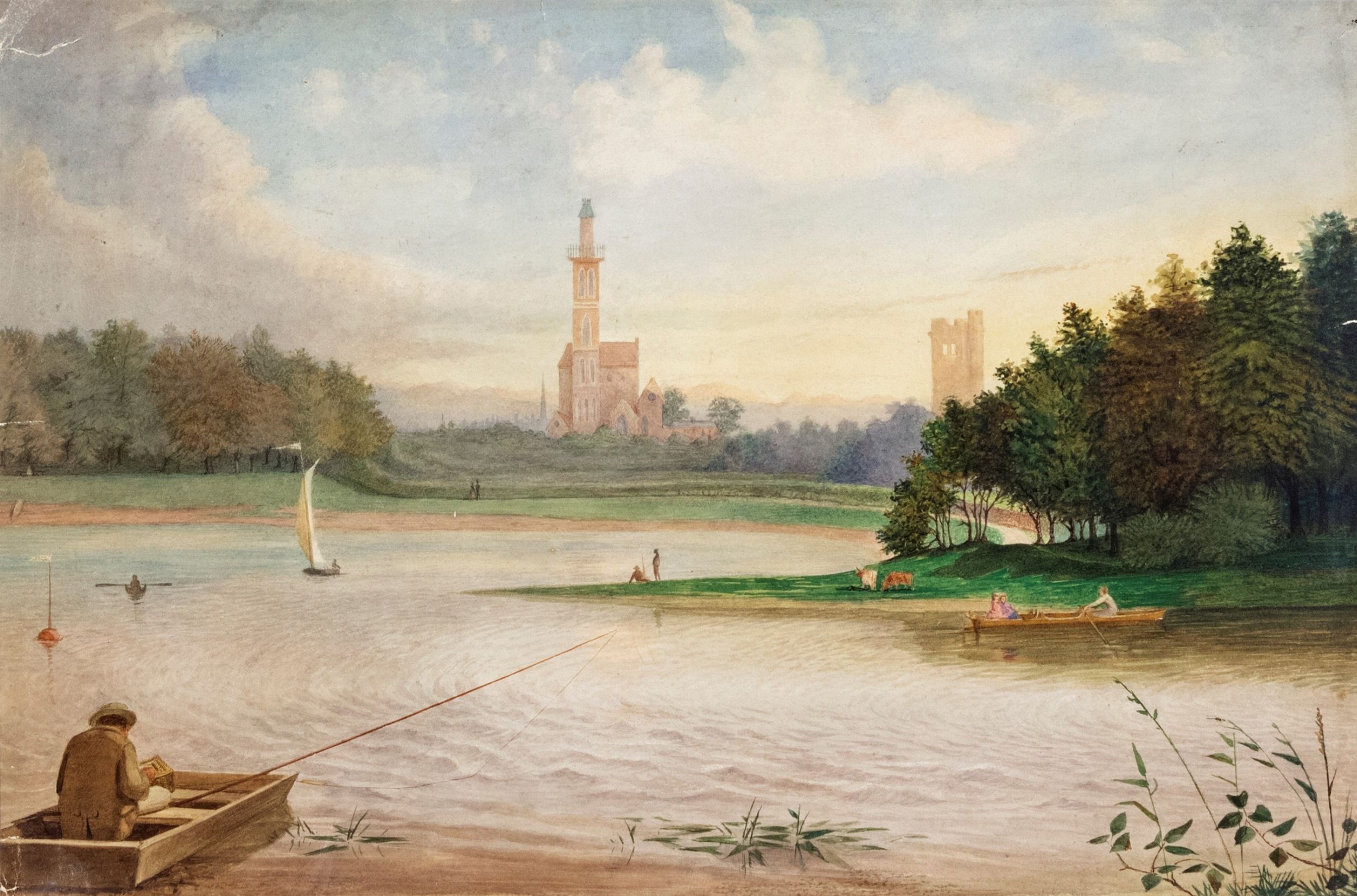 XVIII/XIX Sec. Paesaggio lacustre, tempera su carta, difetti