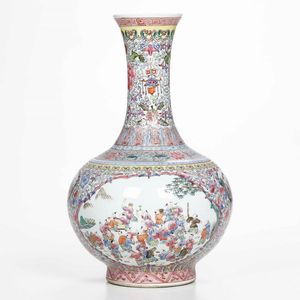Vaso a bottiglia in porcellana a smalti policromi sui toni della Famiglia Rosa con [..]