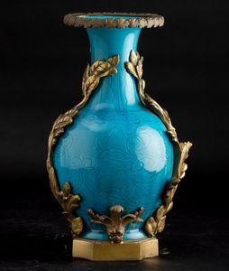 Vaso in porcellana monocroma turchese con decori floreali incisi, Cina, Dinastia [..]