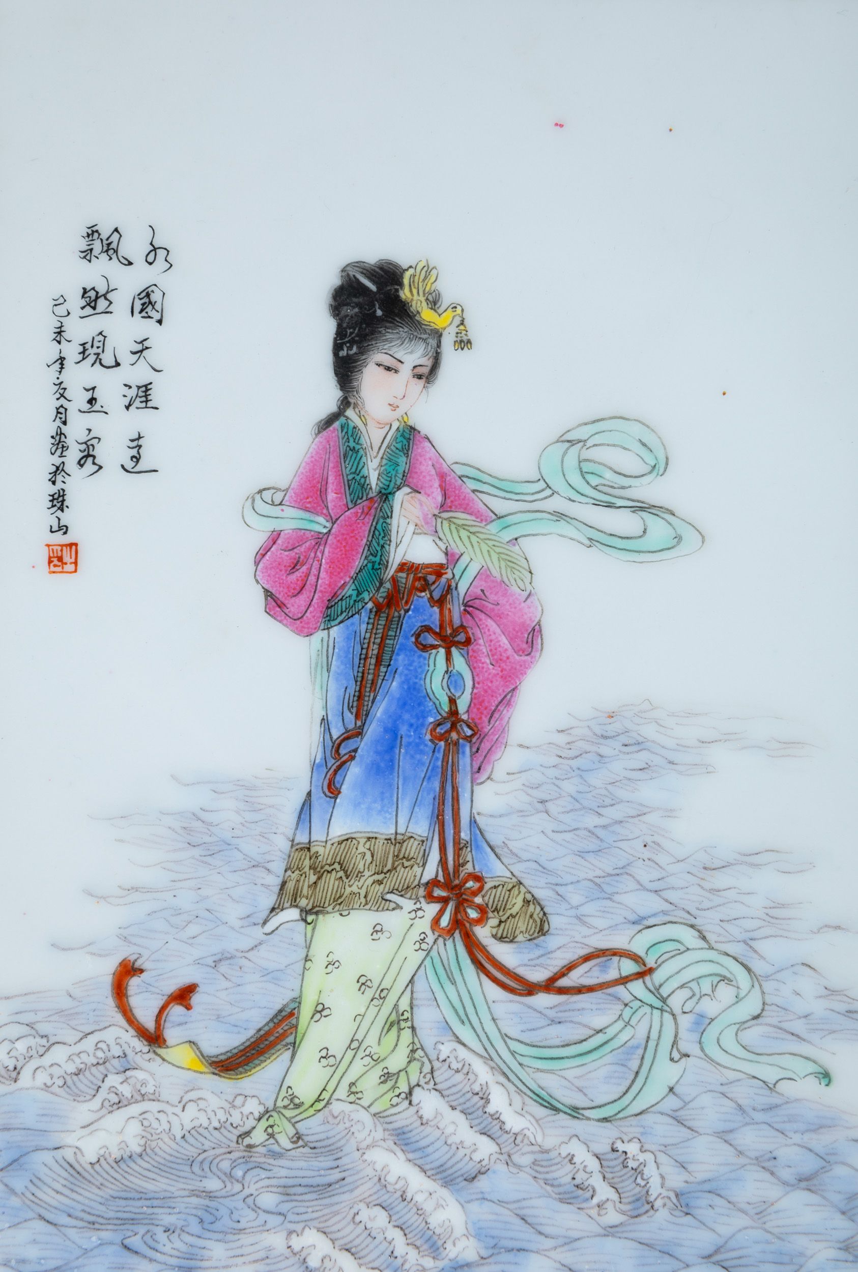 Cinque placche in porcellana a smalti policromi con iscrizioni e fanciulle, Cina, [..]