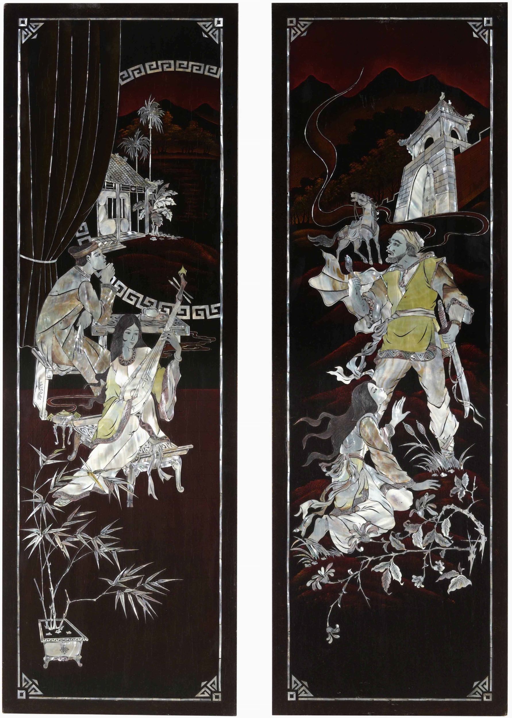 Coppia di pannelli in legno laccato e intarsi in madreperla raffiguranti scene di [..]